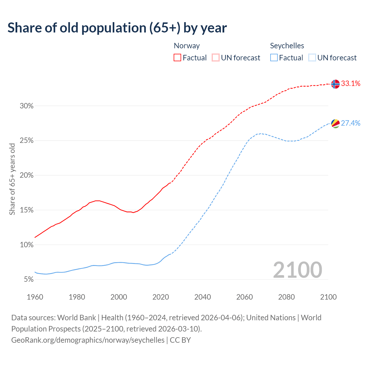 - The share of old-age demographic (65+) in Norway is 18.8% vs 8.54% in the Seychelles.