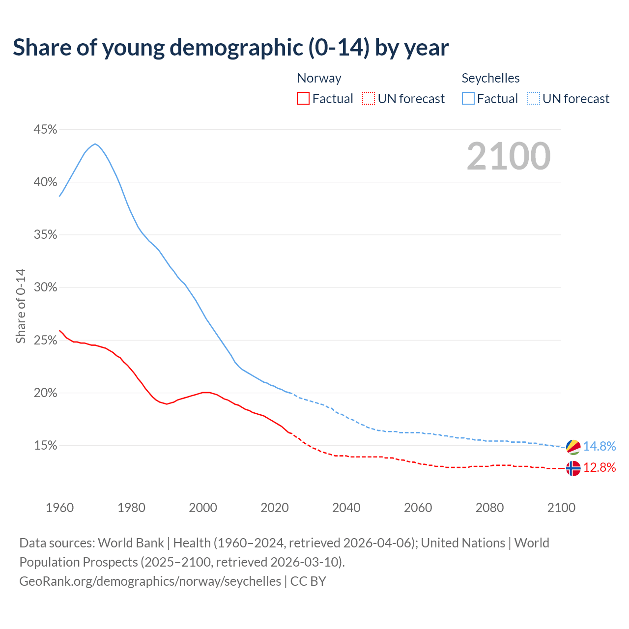 - The share of young demographic (0-15 years old) in Norway is 16.2% vs 20% in the Seychelles.