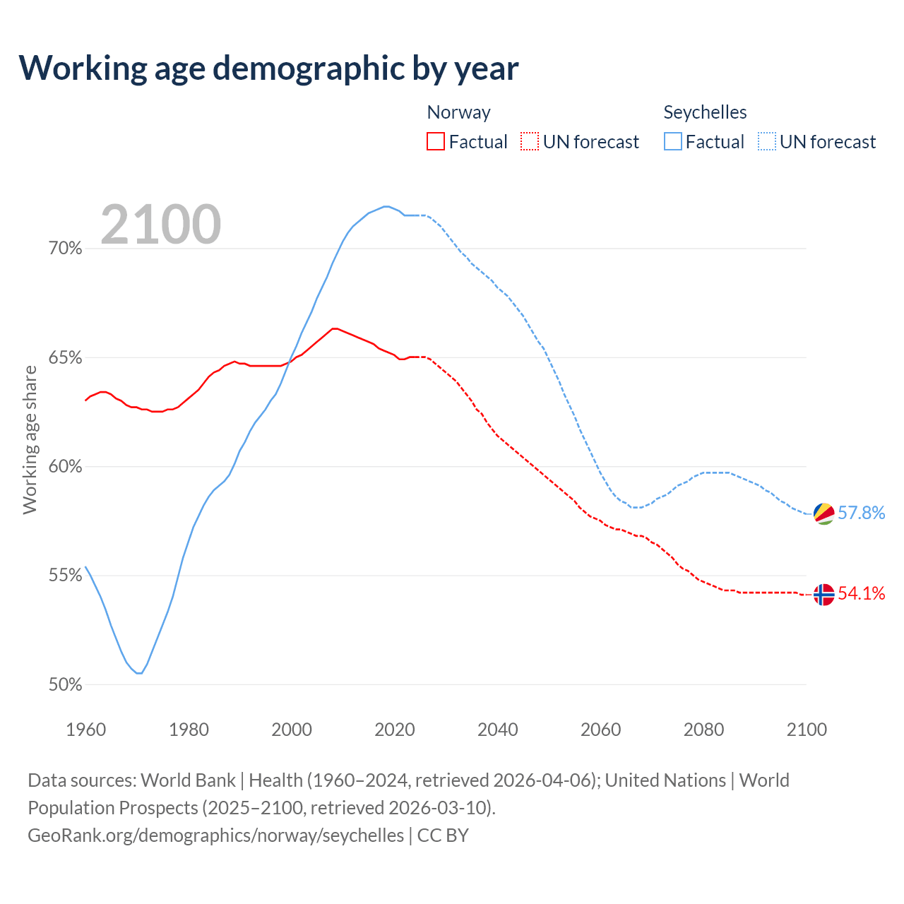 - Norway has 3.69M working age adults (aged 15-64) vs 90.3K in the Seychelles.