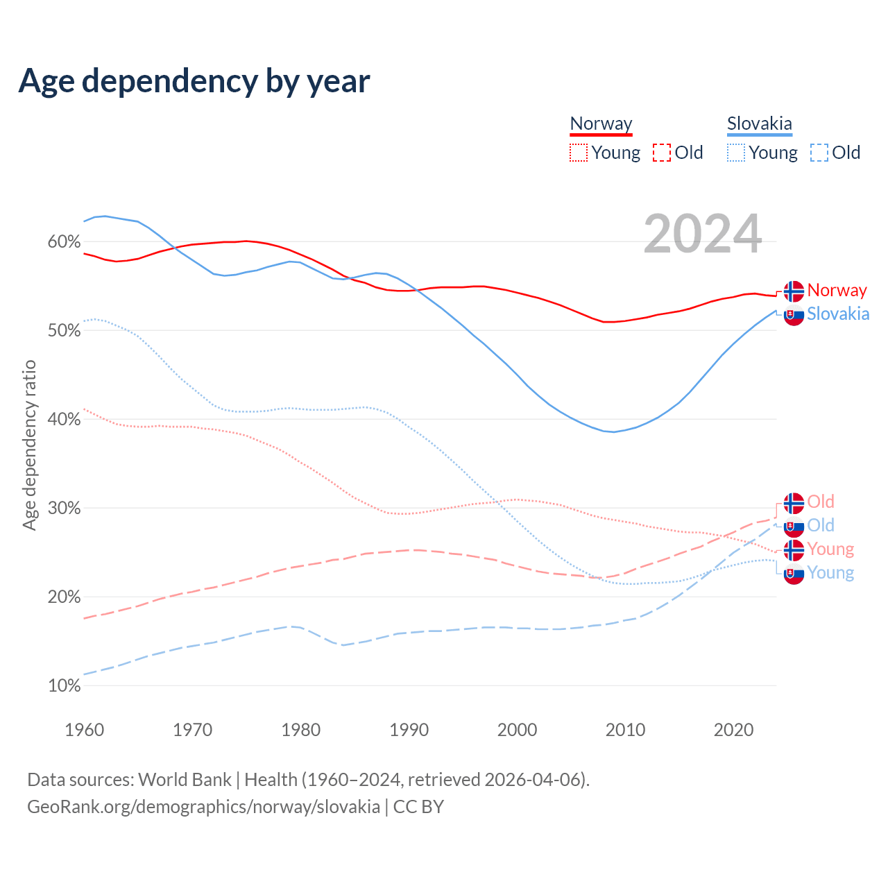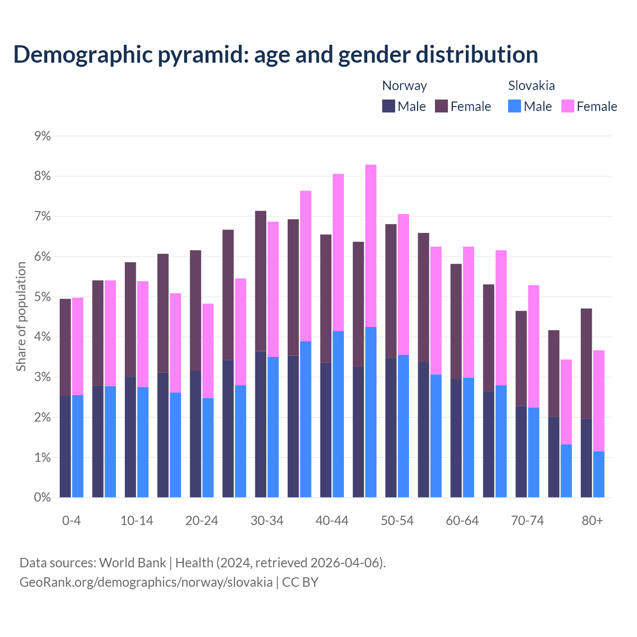 - Norway is ranked 43/196 by median age (oldest to youngest) vs 31/196 for Slovakia.