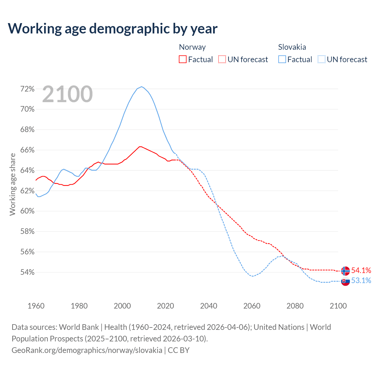 Median age Norway vs Slovakia, 1960-2100