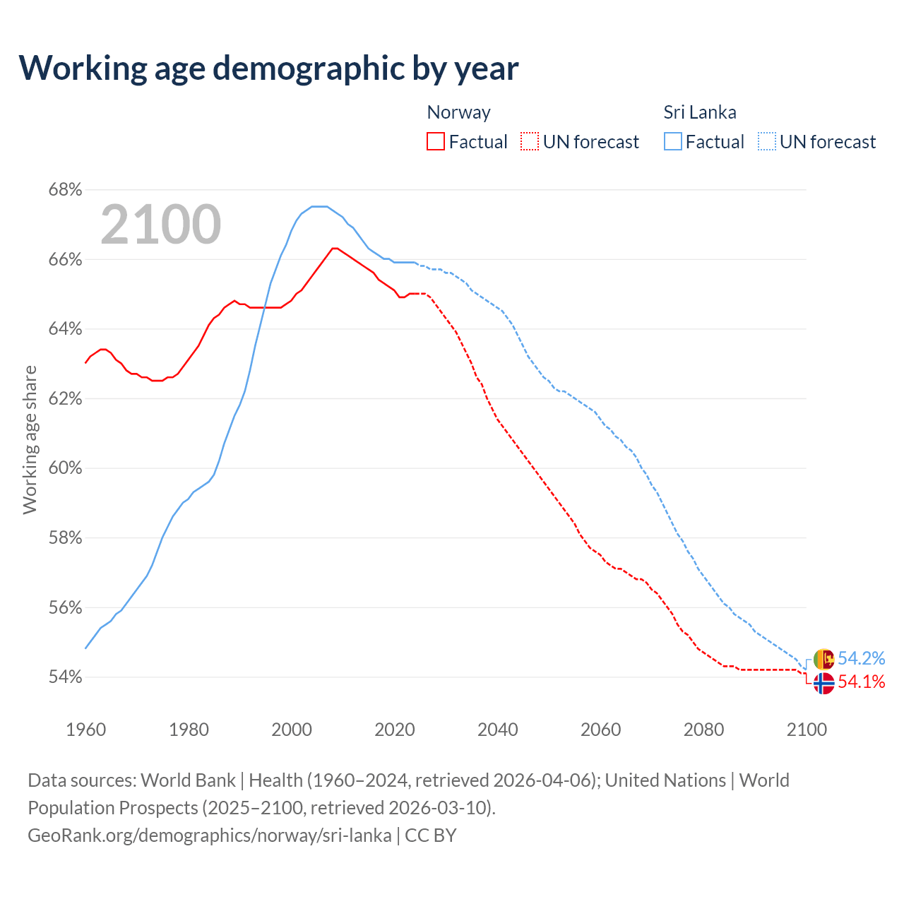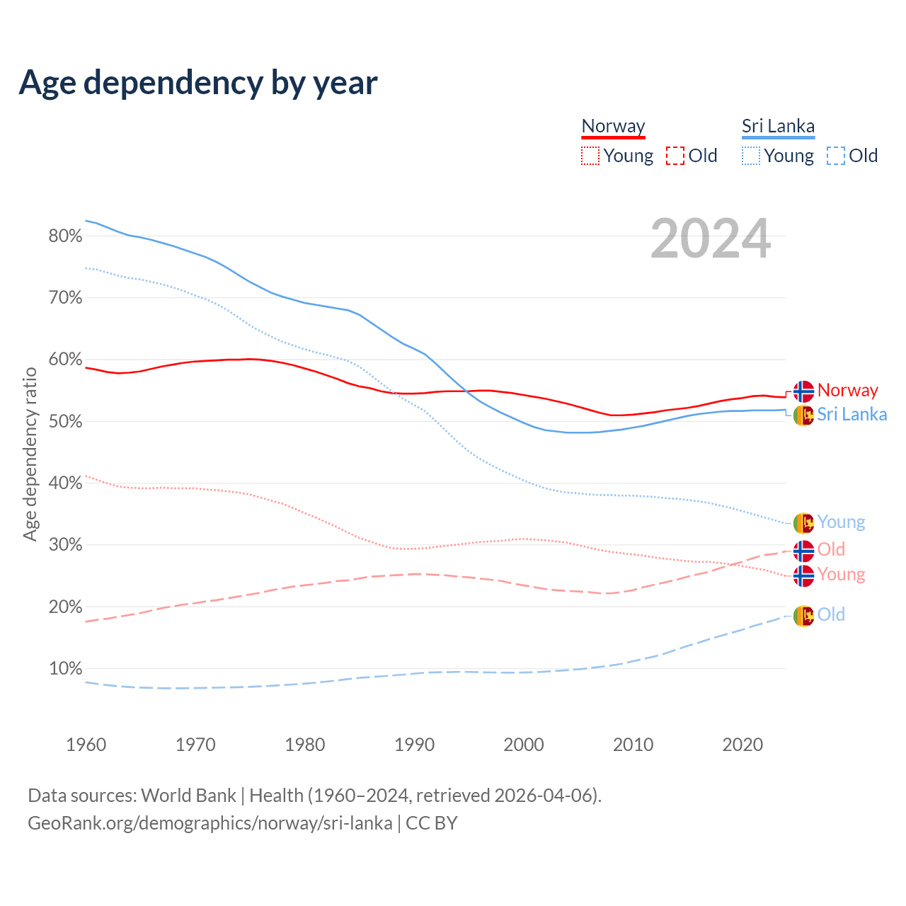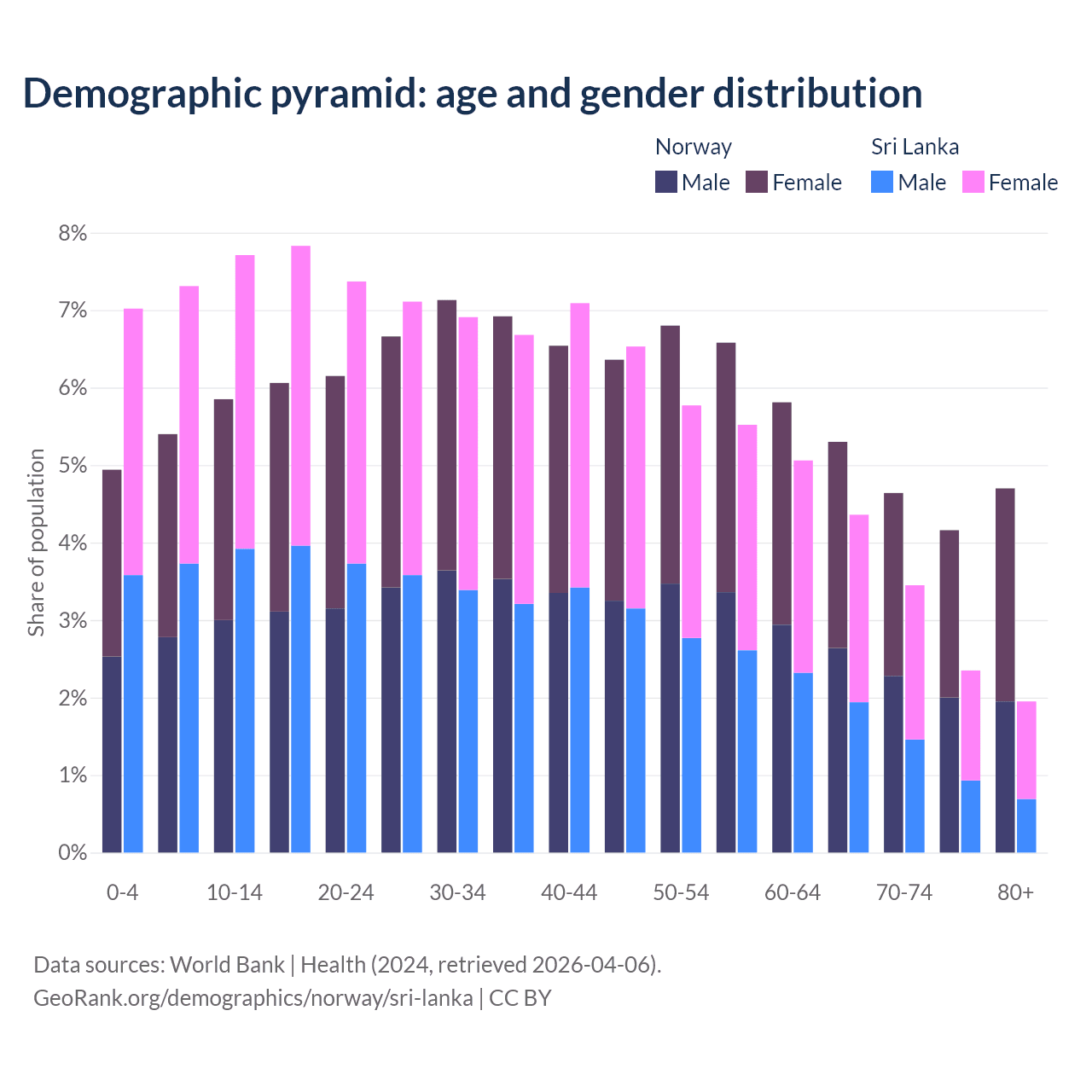 - The share of old-age demographic (65+) in Norway is 18.8% vs 12.1% in Sri Lanka.
