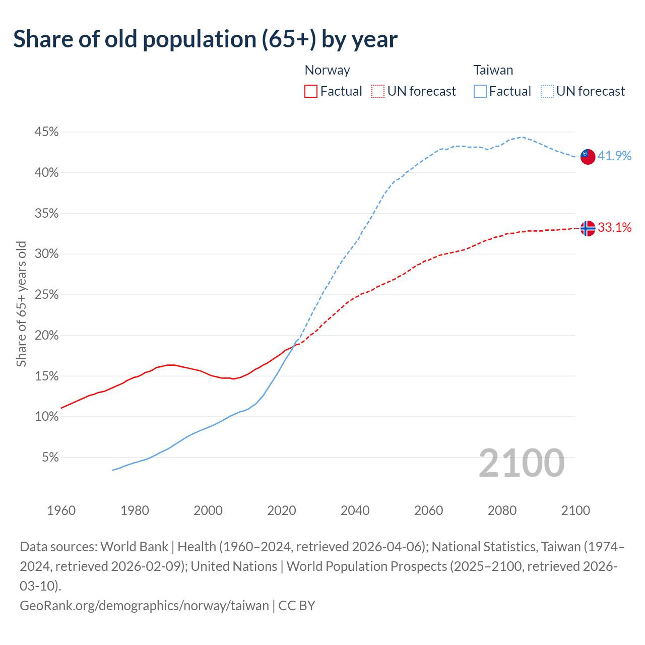 The share of older people aged 65 and over is 18.8% in Norway and 19.2% in Taiwan. Life expectancy in Norway compared to Taiwan .