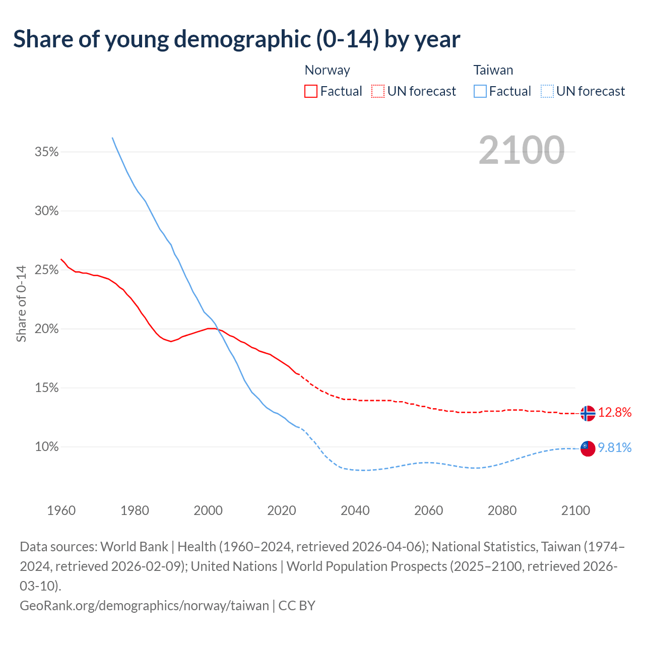 - The share of young demographic (0-15 years old) in Norway is 16.2% vs 11.7% in Taiwan.