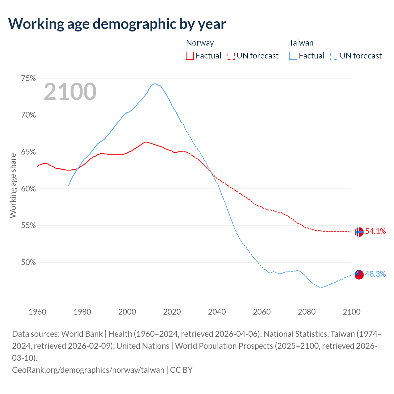 Median age Norway vs Taiwan, 1960-2100