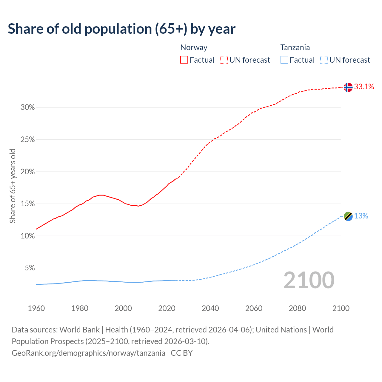 - The share of old-age demographic (65+) in Norway is 18.8% vs 3.05% in Tanzania.