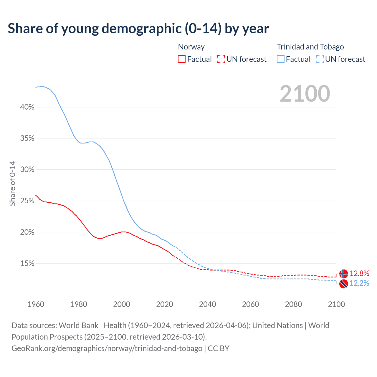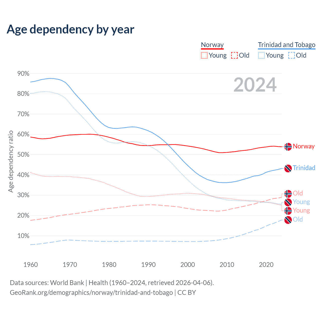 - The share of young demographic (0-15 years old) in Norway is 16.2% vs 17.8% in Trinidad and Tobago.