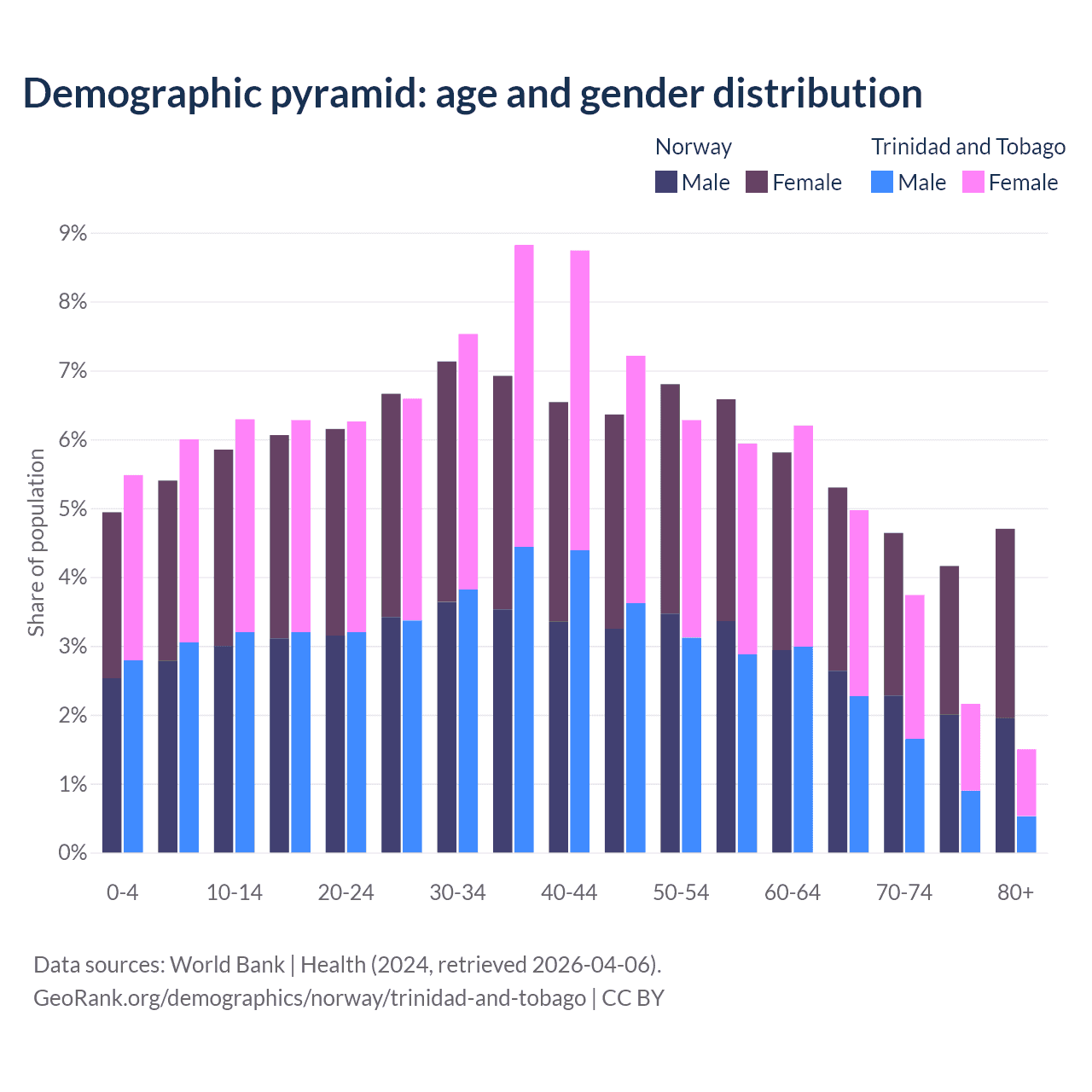 - The share of old-age demographic (65+) in Norway is 18.8% vs 12.4% in Trinidad and Tobago.