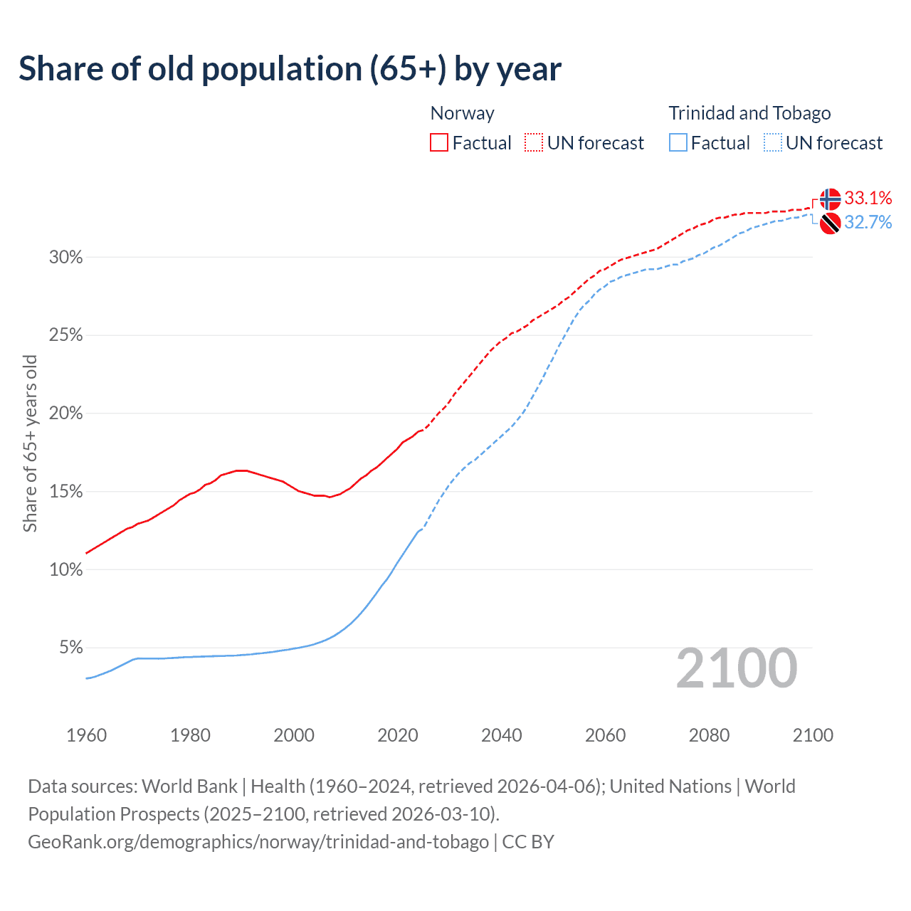 The share of older people aged 65 and over is 18.8% in Norway and 12.4% in Trinidad and Tobago. Life expectancy in Norway compared to Trinidad and Tobago .