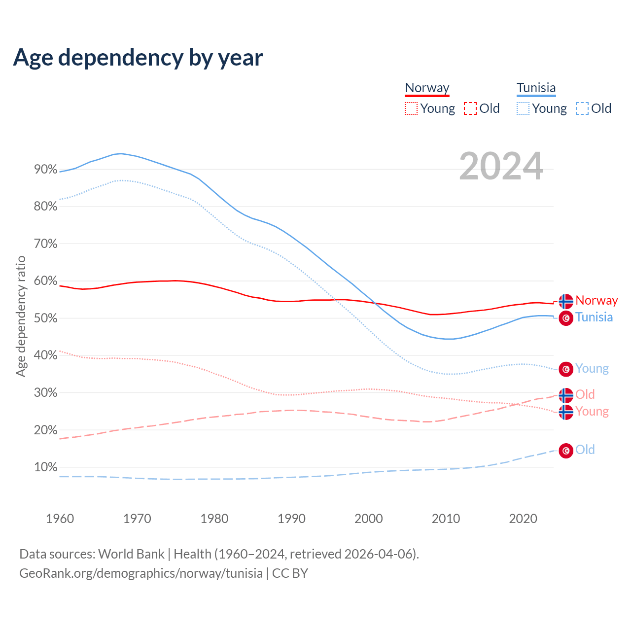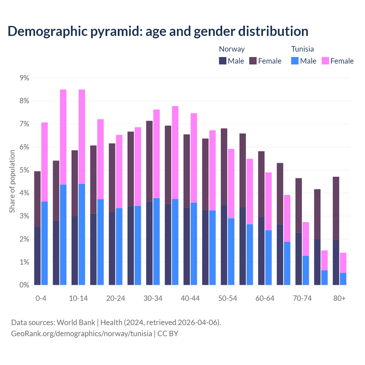 - Norway is ranked 43/196 by median age (oldest to youngest) vs 86/196 for Tunisia.