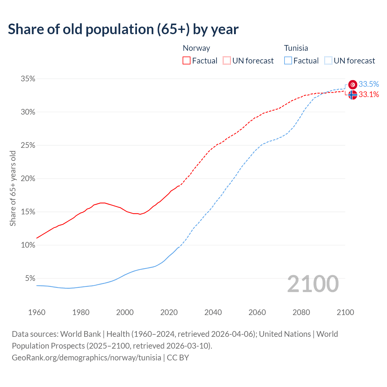 The share of older people aged 65 and over is 18.8% in Norway and 9.53% in Tunisia. Life expectancy in Norway compared to Tunisia .