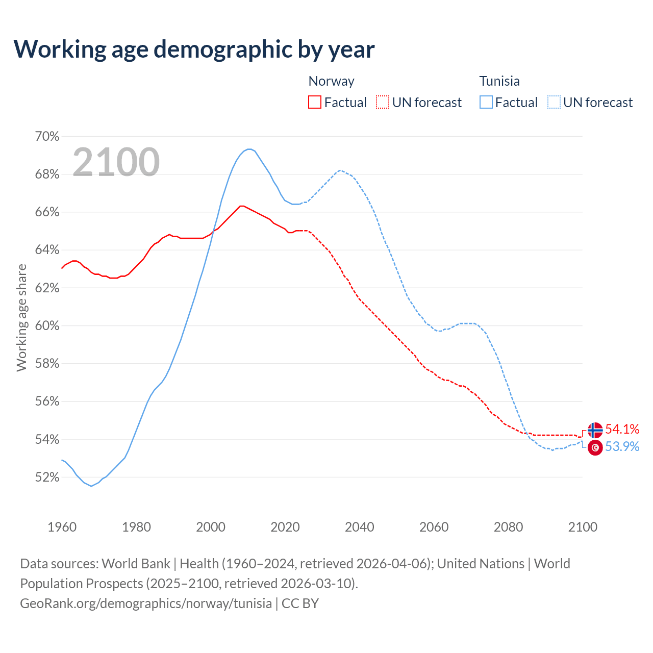 - Norway has 3.69M working age adults (aged 15-64) vs 8.26M in Tunisia.