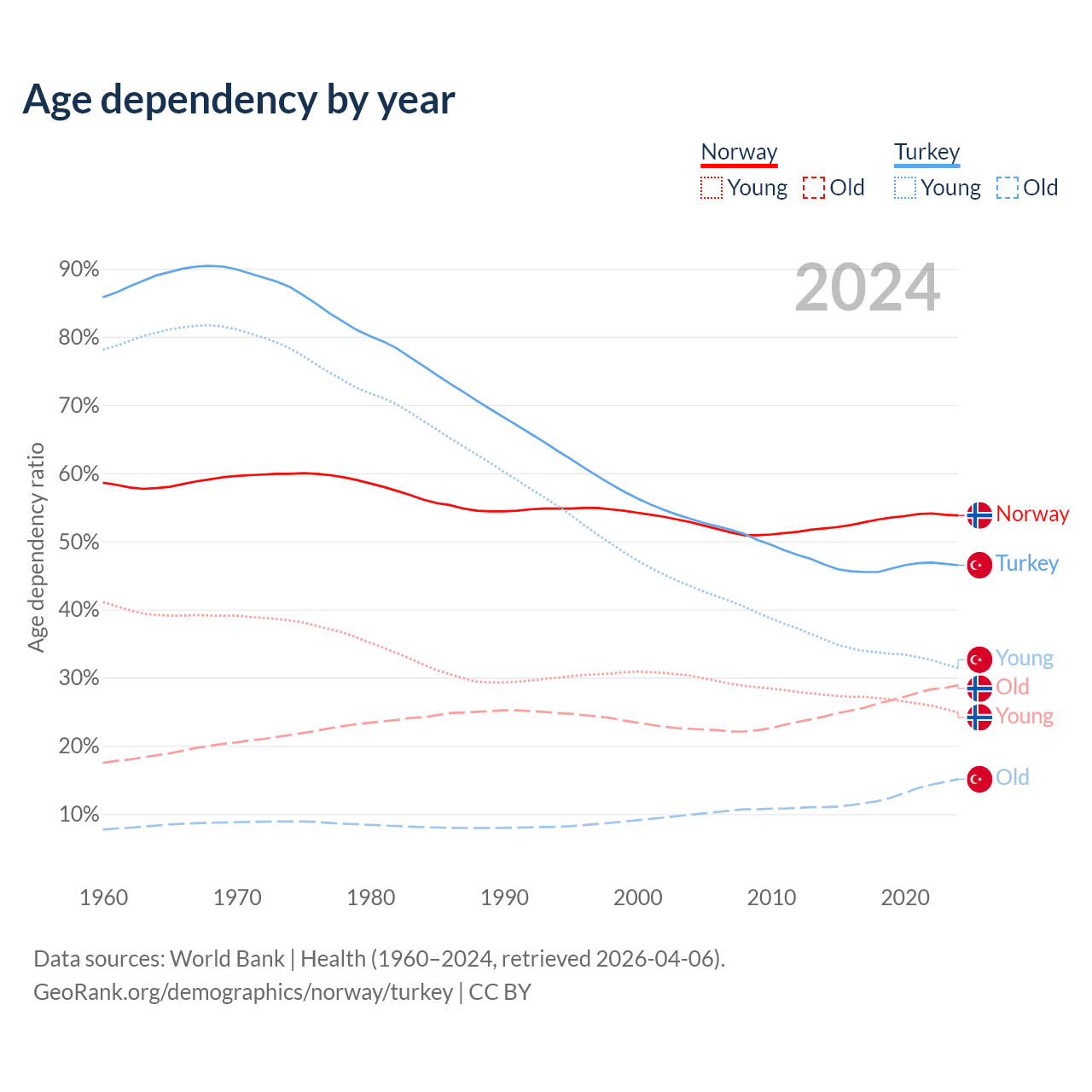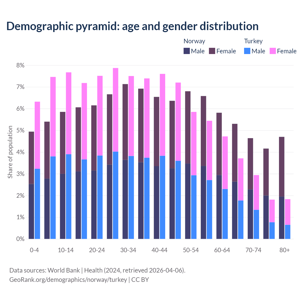 - Norway is ranked 43/196 by median age (oldest to youngest) vs 83/196 for Turkey.