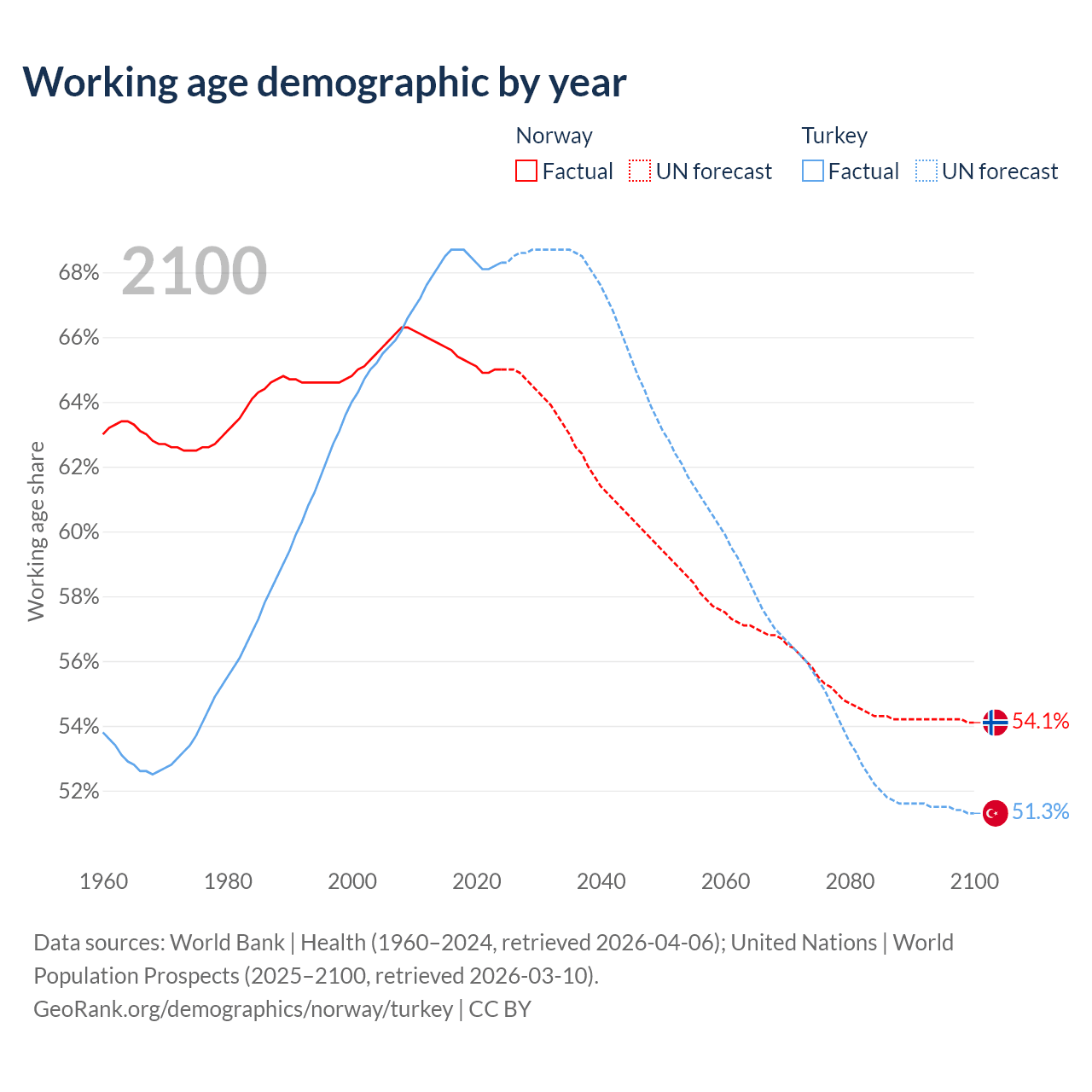 Median age Norway vs Turkey, 1960-2100