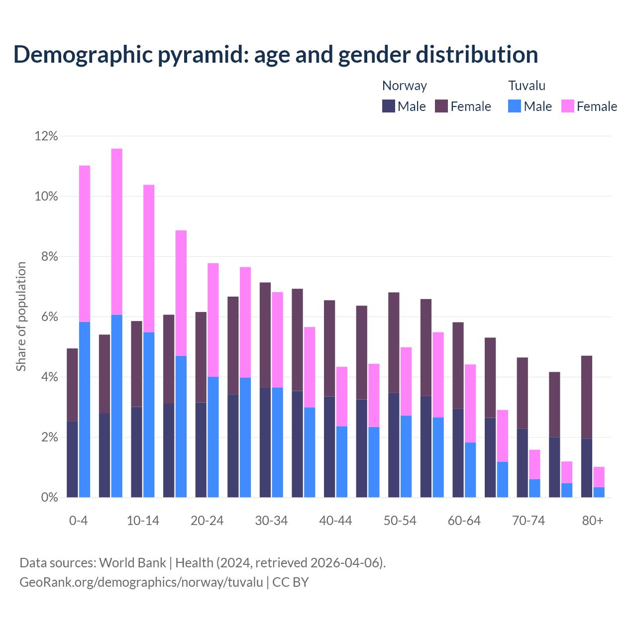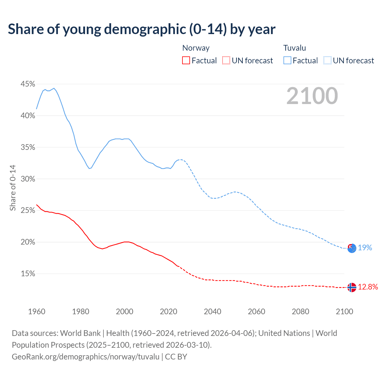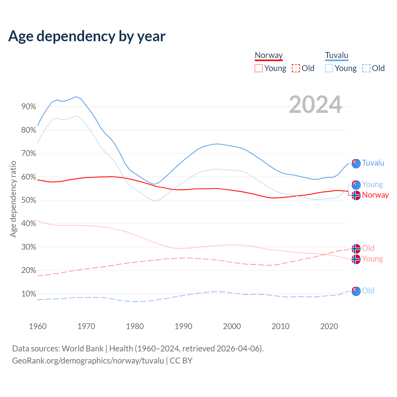 - The share of young demographic (0-15 years old) in Norway is 16.2% vs 32.9% in Tuvalu.