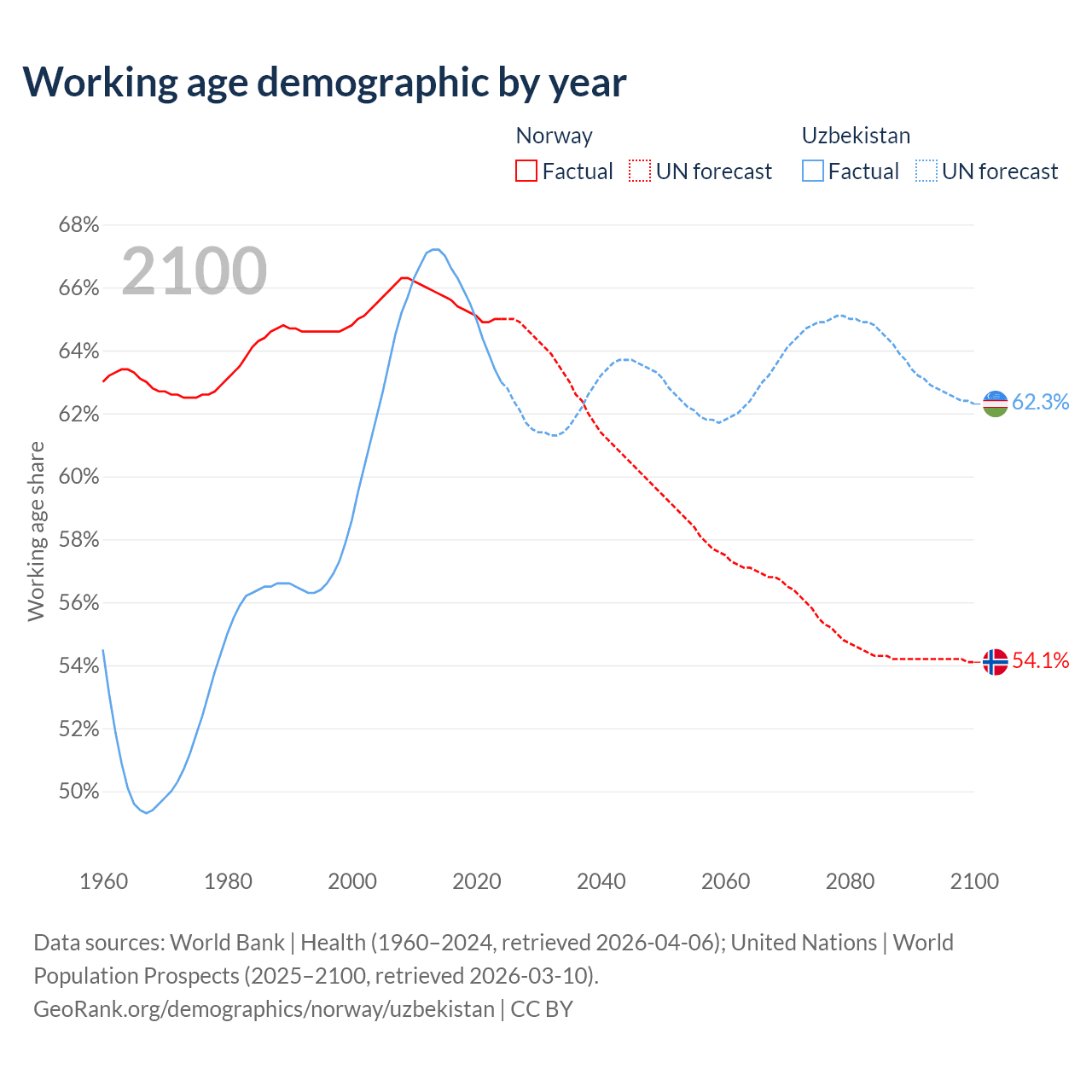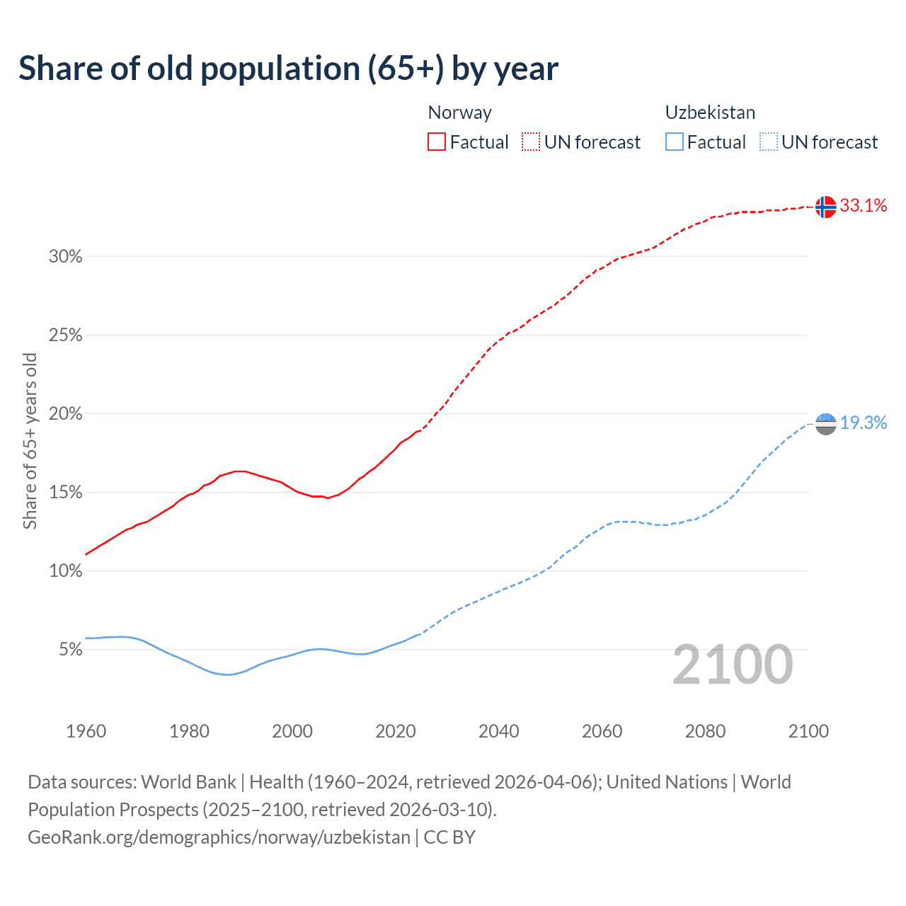 - The share of old-age demographic (65+) in Norway is 18.8% vs 5.86% in Uzbekistan.