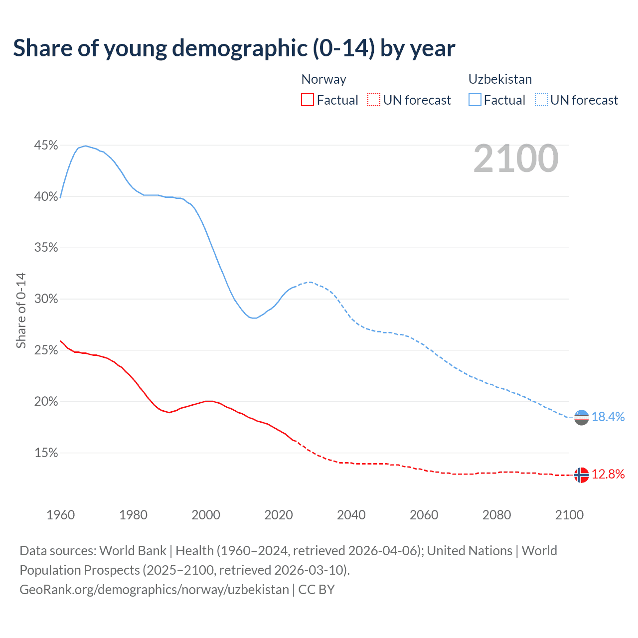 - The share of young demographic (0-15 years old) in Norway is 16.2% vs 31.1% in Uzbekistan.