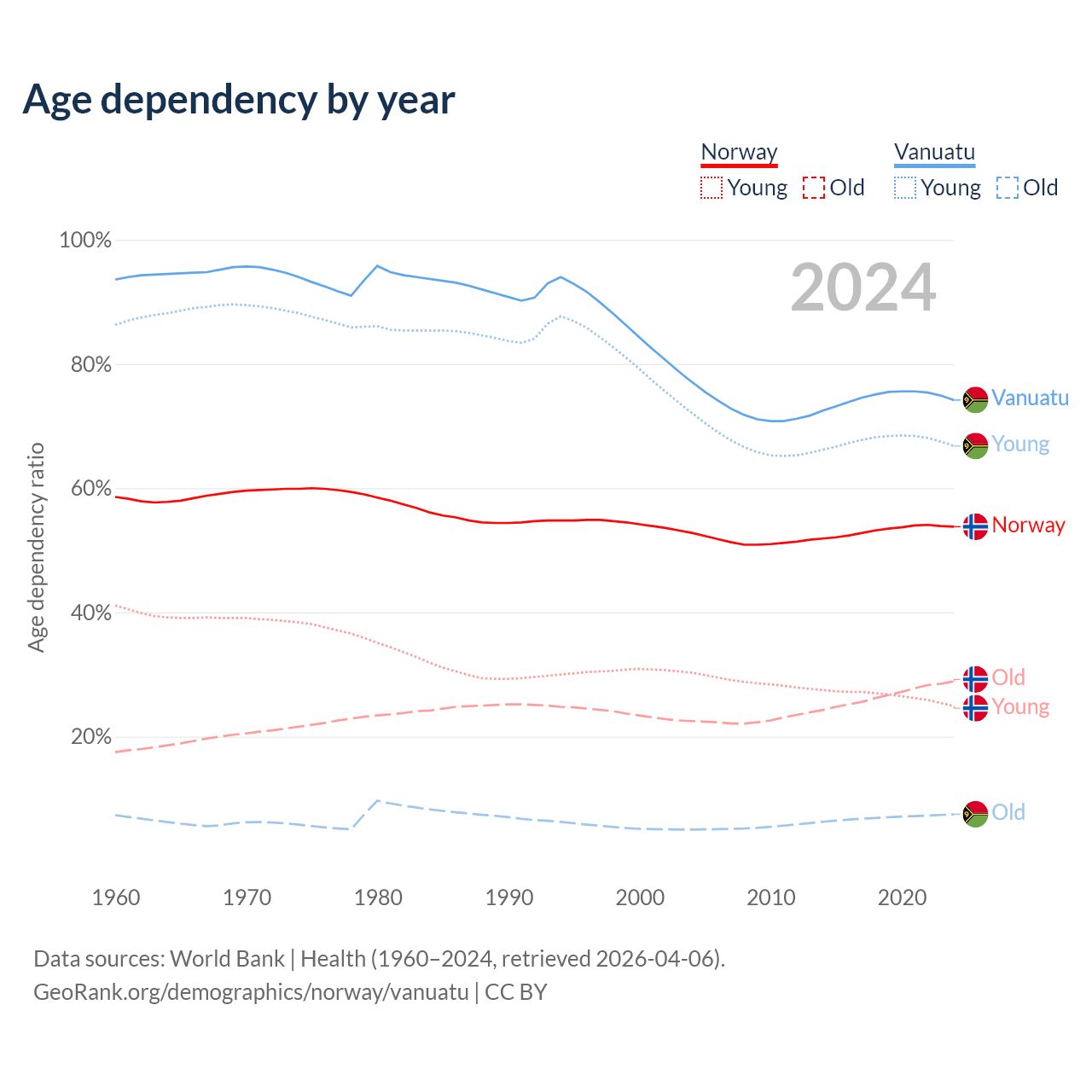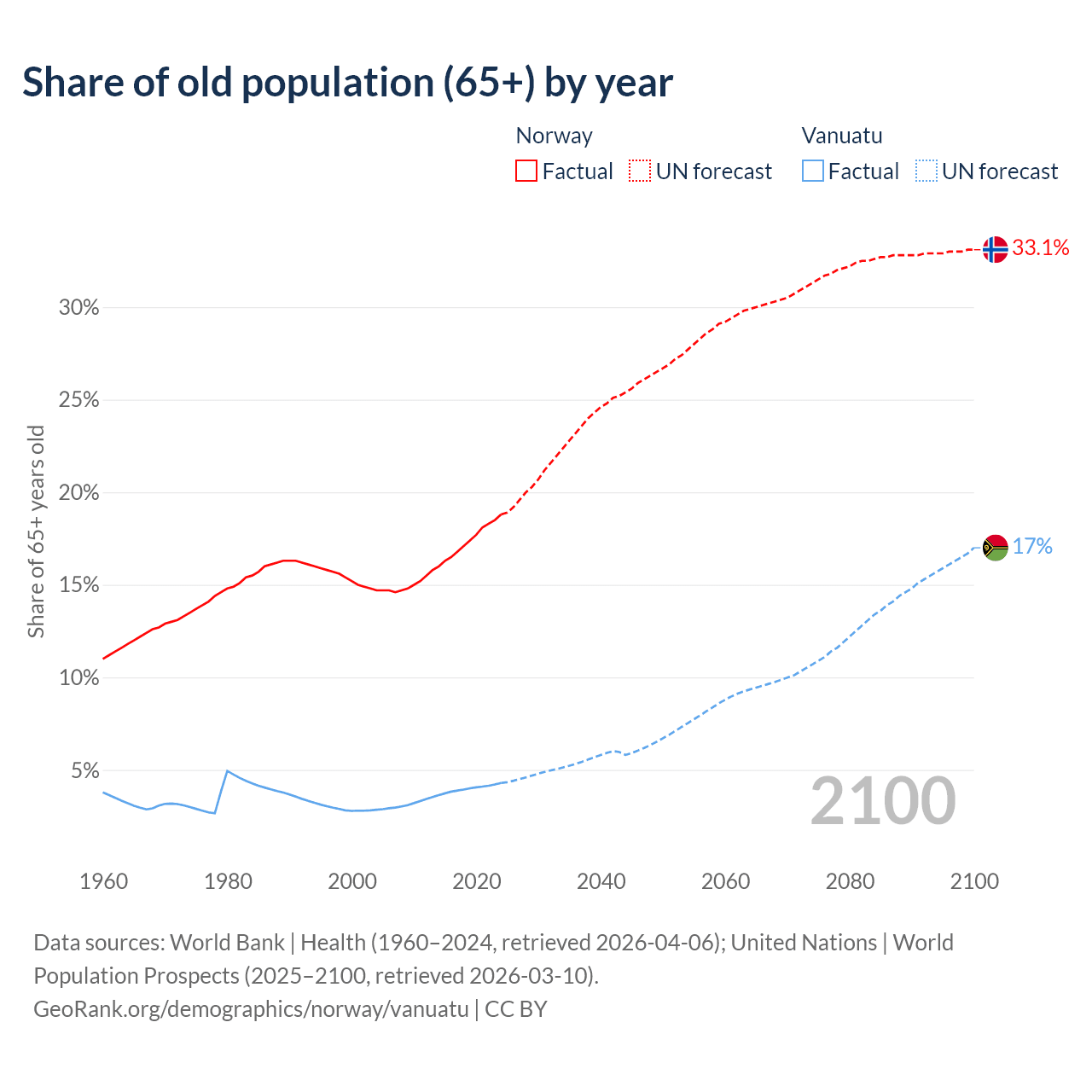 - The share of old-age demographic (65+) in Norway is 18.8% vs 4.3% in Vanuatu.