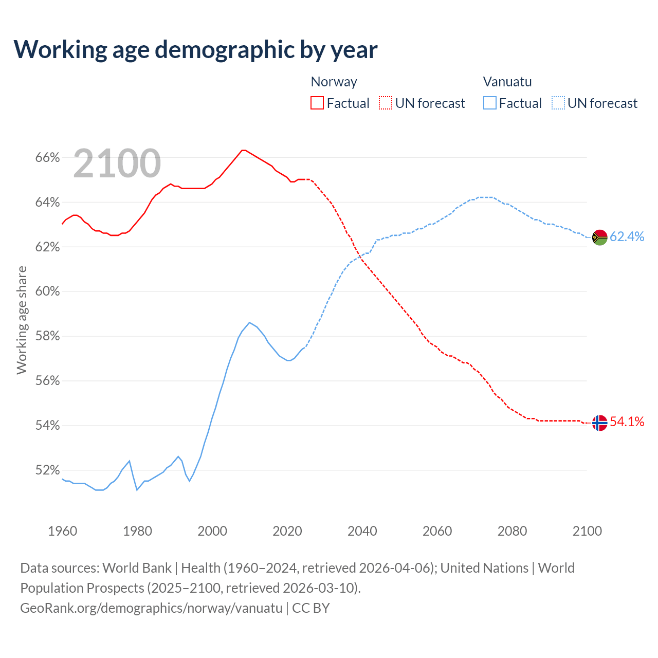 - Norway has 3.69M working age adults (aged 15-64) vs 198K in Vanuatu.