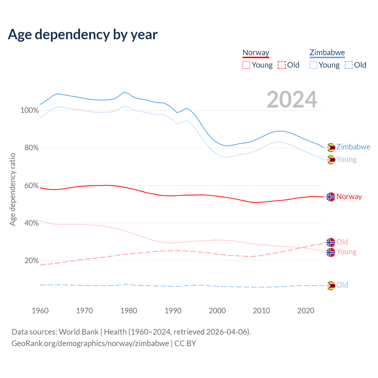 - The share of old-age demographic (65+) in Norway is 18.8% vs 3.6% in Zimbabwe.