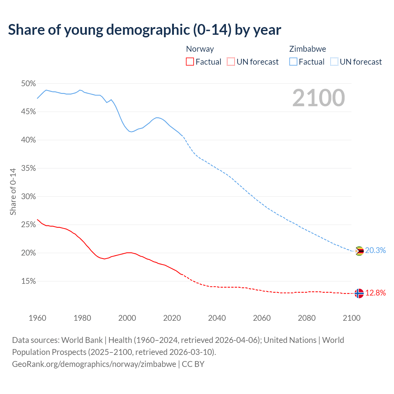 - The share of young demographic (0-15 years old) in Norway is 16.2% vs 40.9% in Zimbabwe.