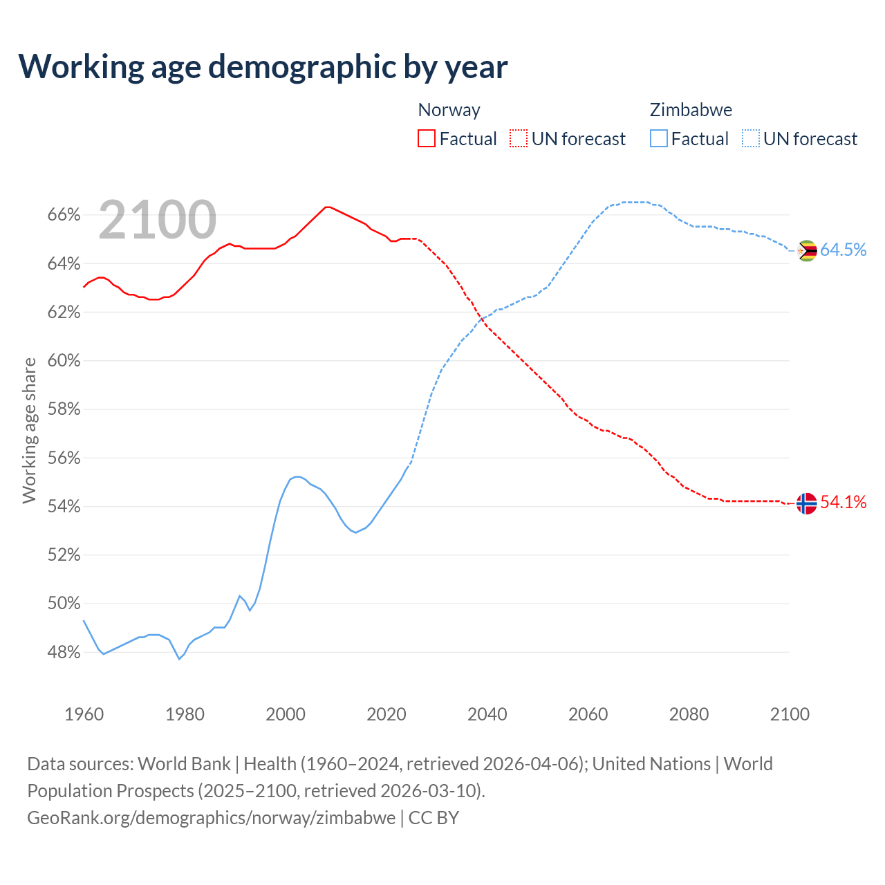 Median age Norway vs Zimbabwe, 1960-2100