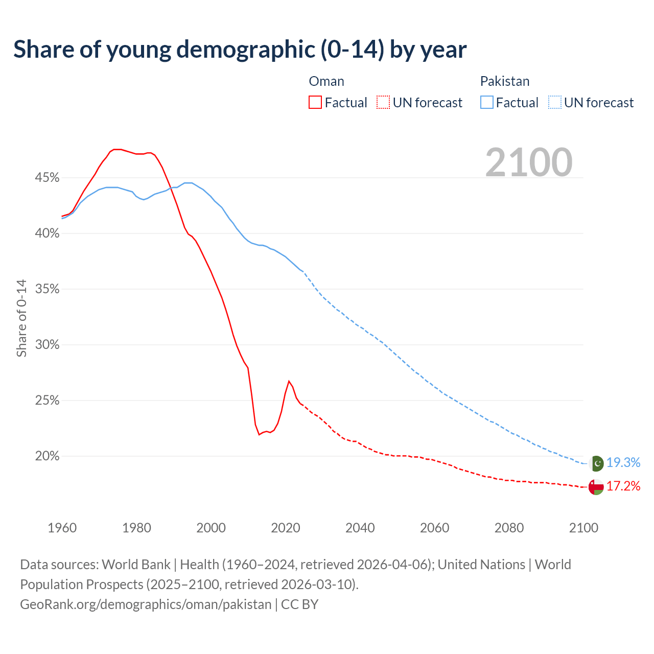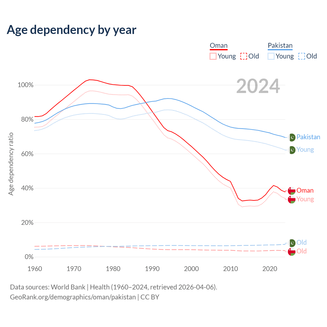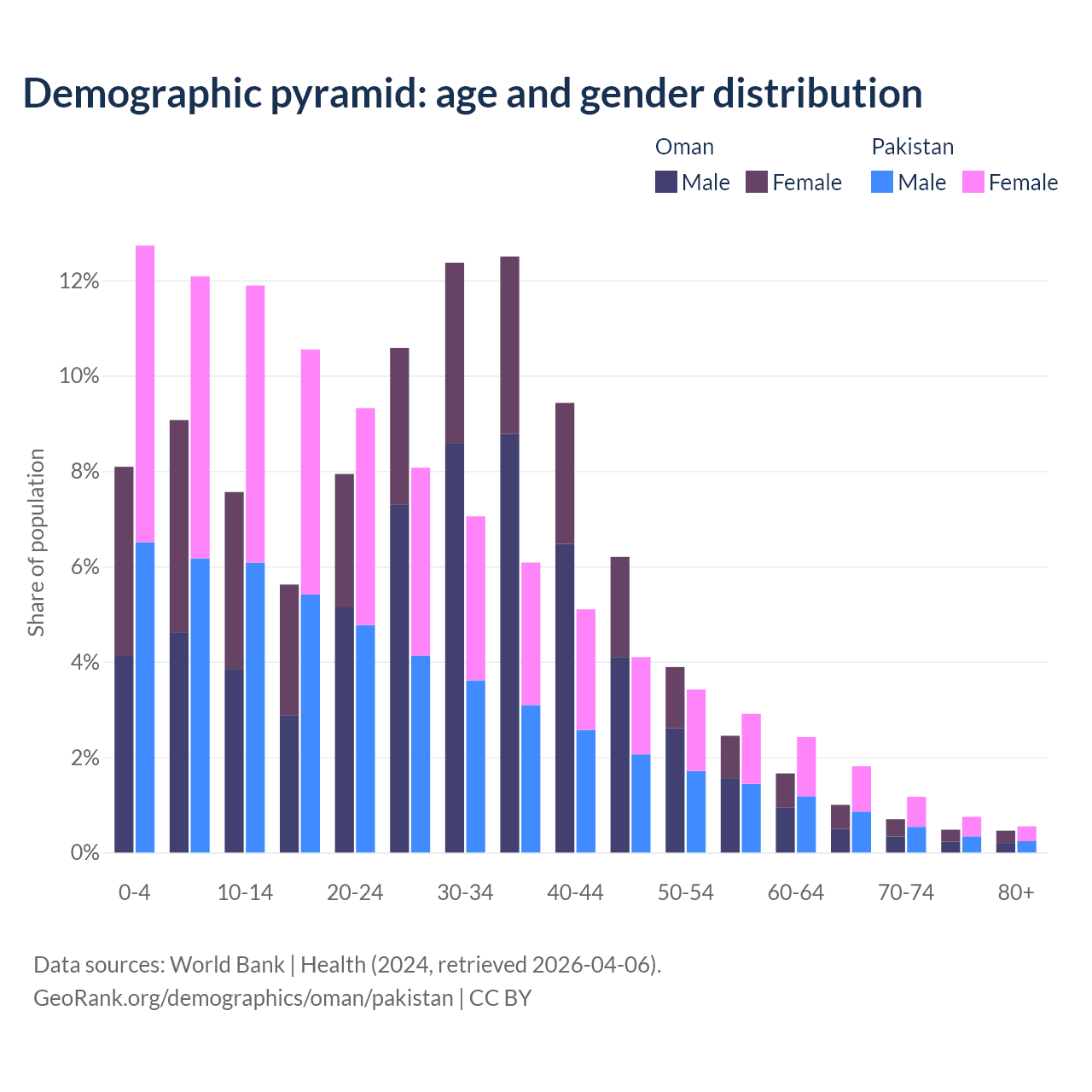 - Oman is ranked 101/196 by median age (oldest to youngest) vs 154/196 for Pakistan.