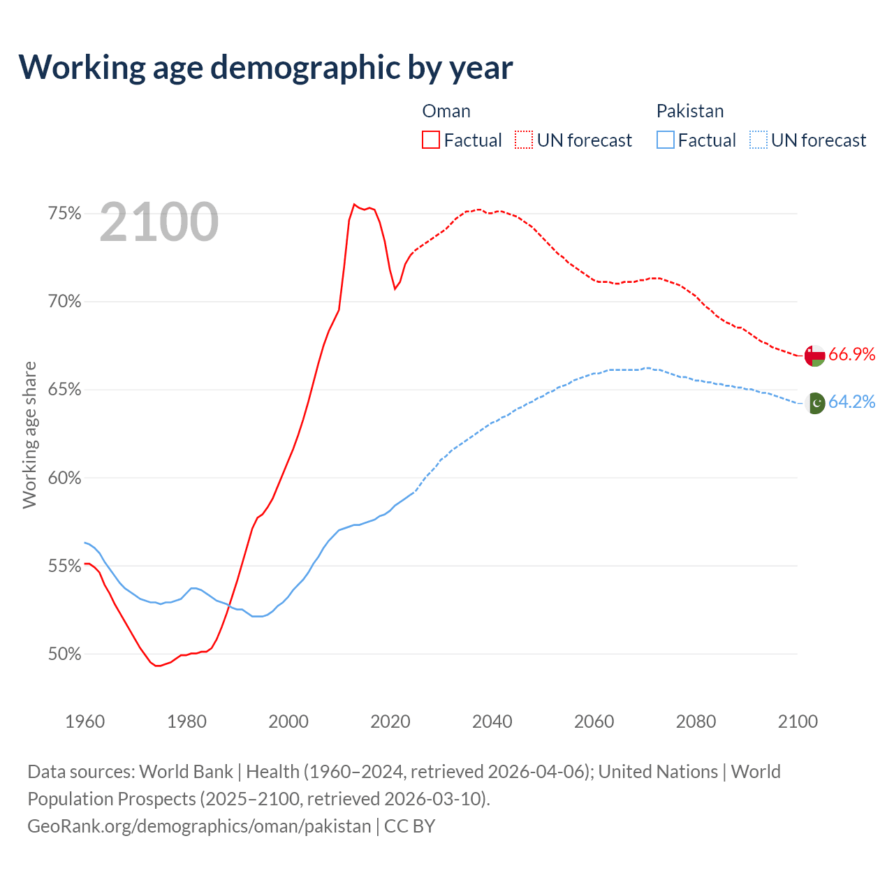 - Oman has 4.19M working age adults (aged 15-64) vs 154M in Pakistan.