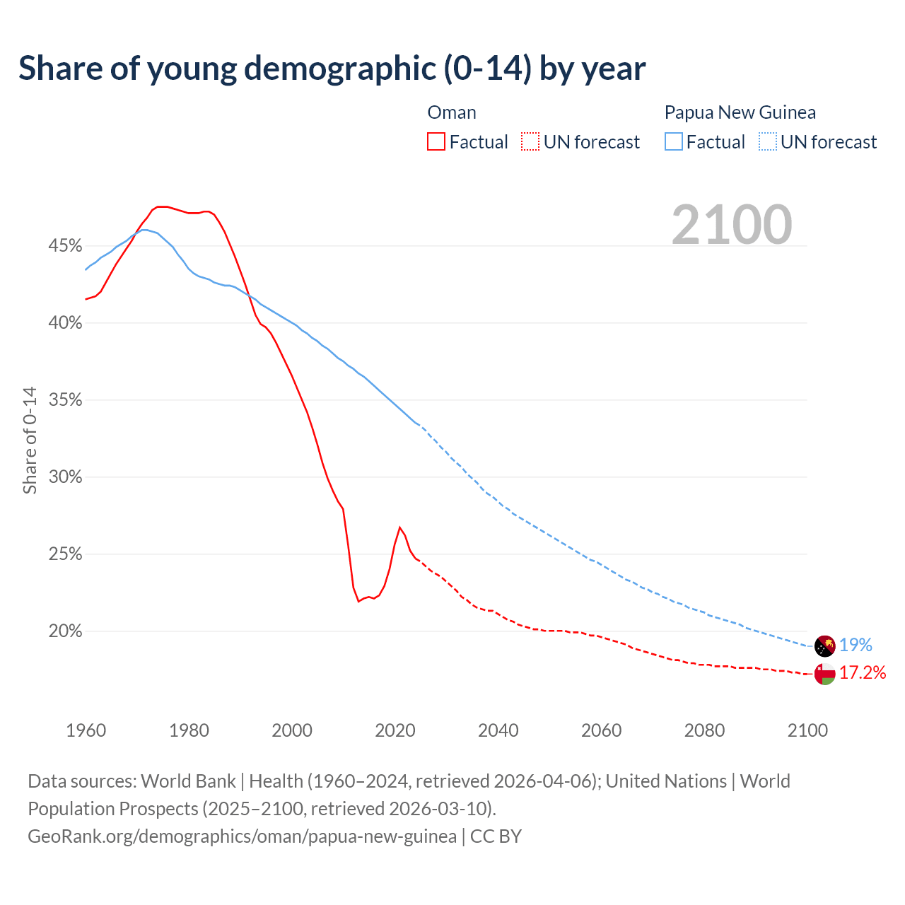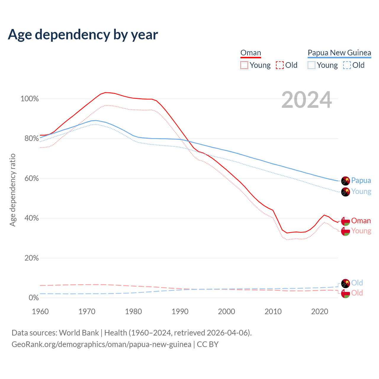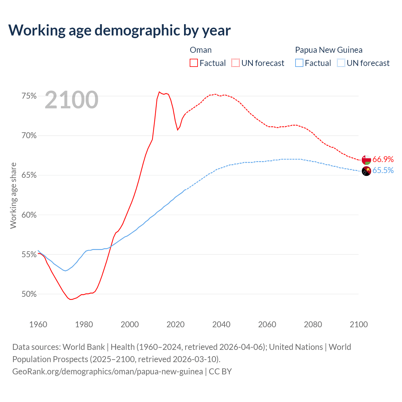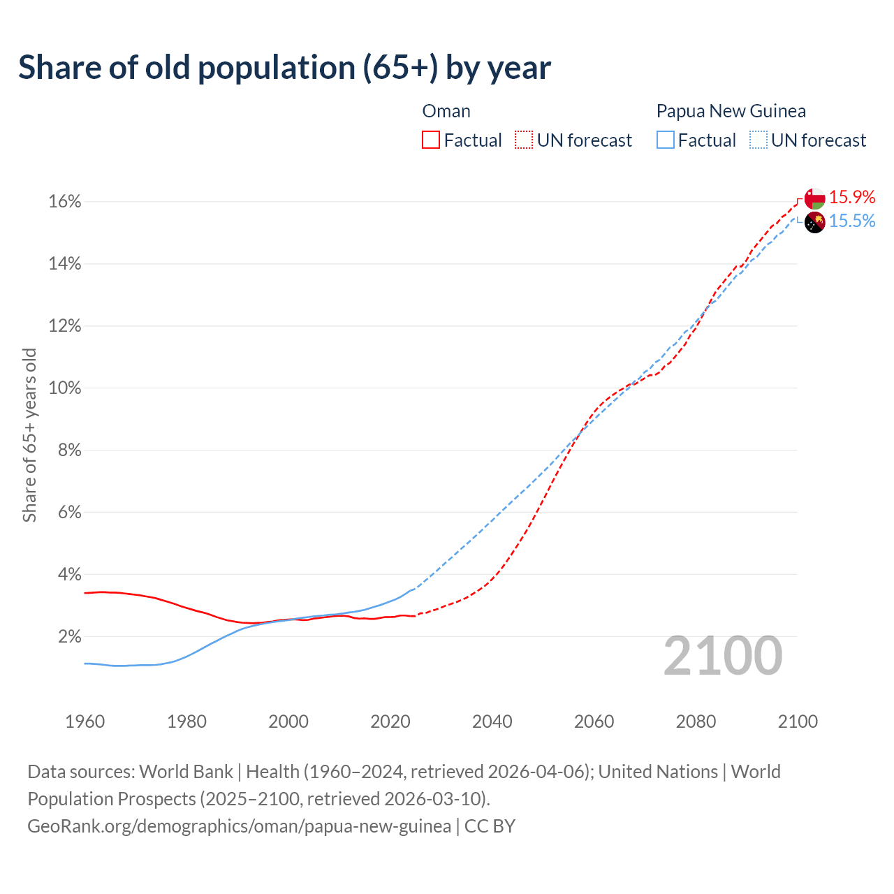 The share of older people aged 65 and over is 2.64% in Oman and 3.46% in Papua New Guinea. Life expectancy in Oman compared to Papua New Guinea .