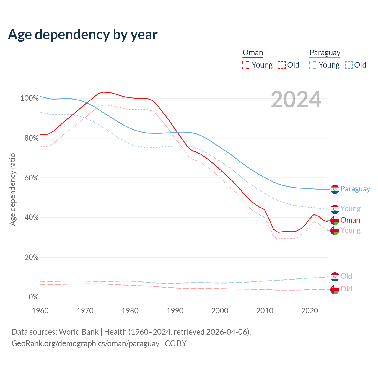 - Oman is ranked 101/196 by median age (oldest to youngest) vs 118/196 for Paraguay.