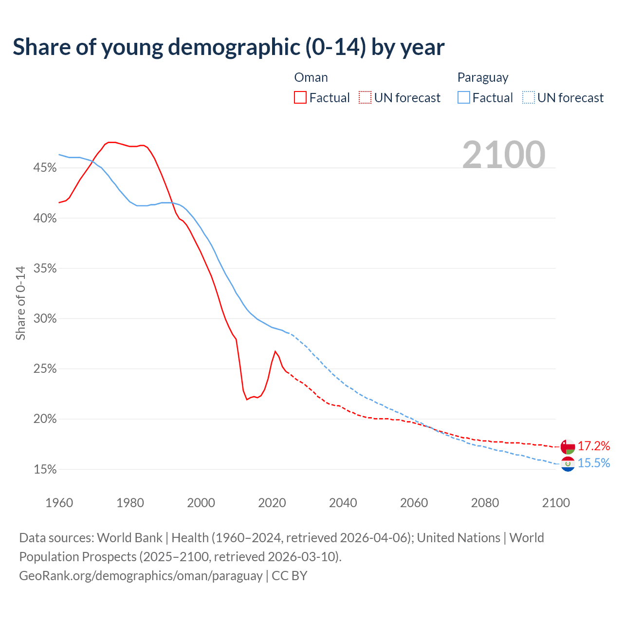 - The share of young demographic (0-15 years old) in Oman is 24.7% vs 28.6% in Paraguay.