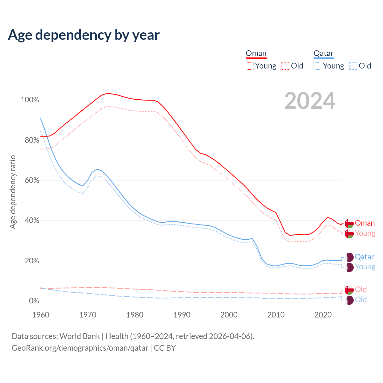 The share of older people aged 65 and over is 2.64% in Oman and 1.68% in Qatar. Life expectancy in Oman compared to Qatar .