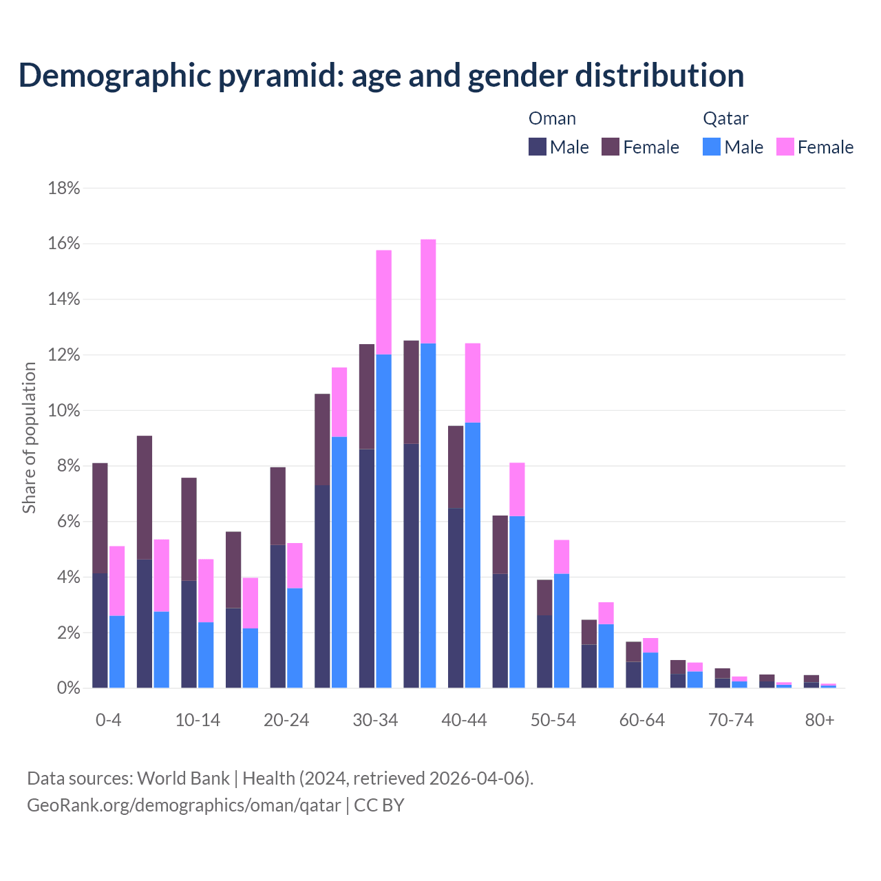 - Oman is ranked 101/196 by median age (oldest to youngest) vs 78/196 for Qatar.