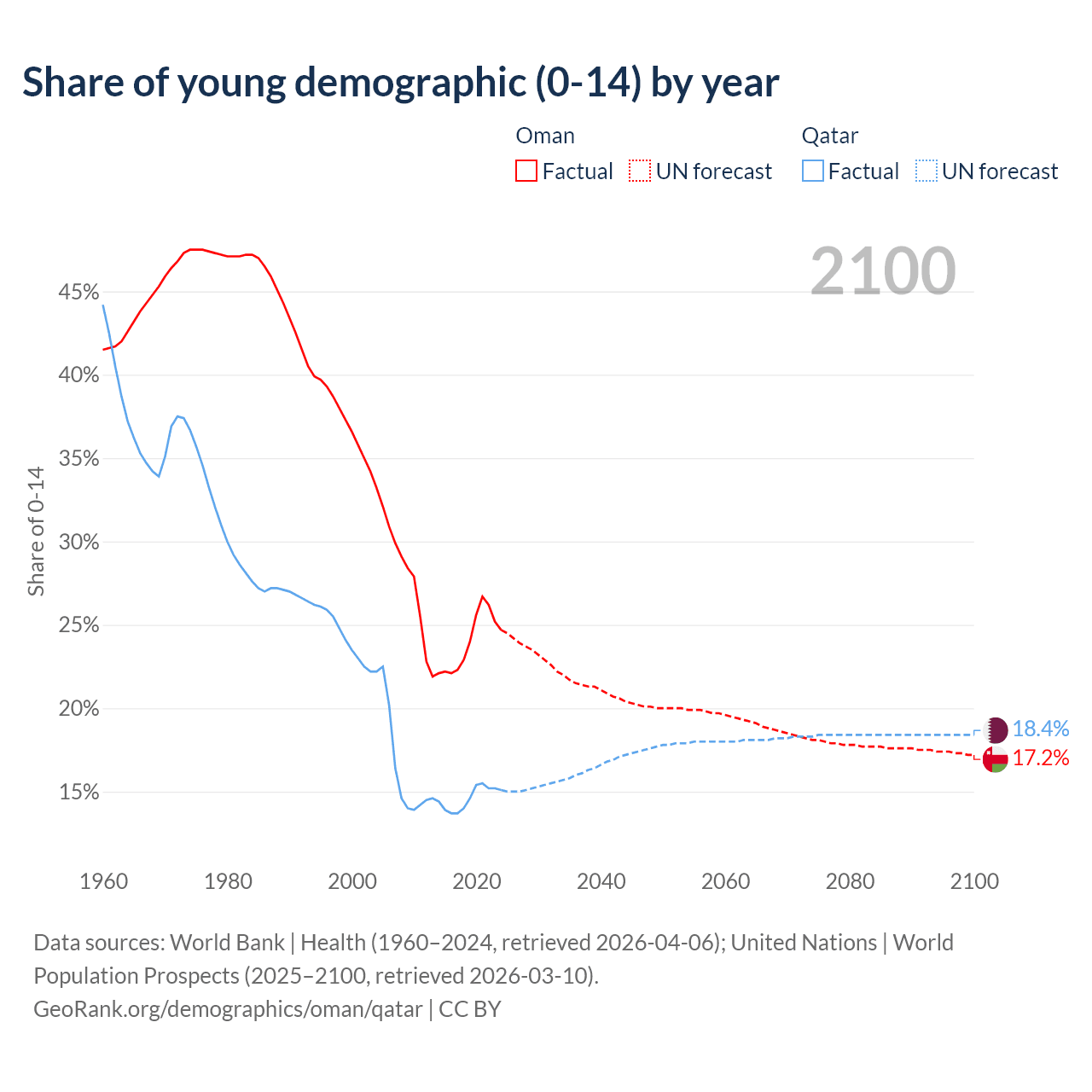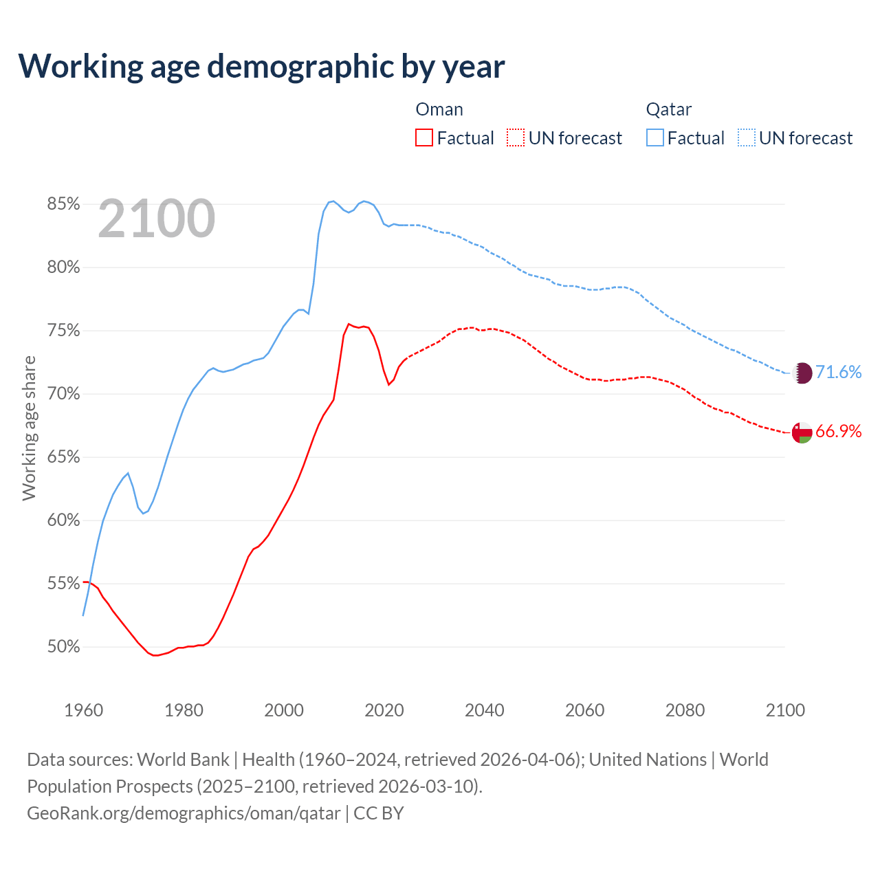 Median age Oman vs Qatar, 1960-2100