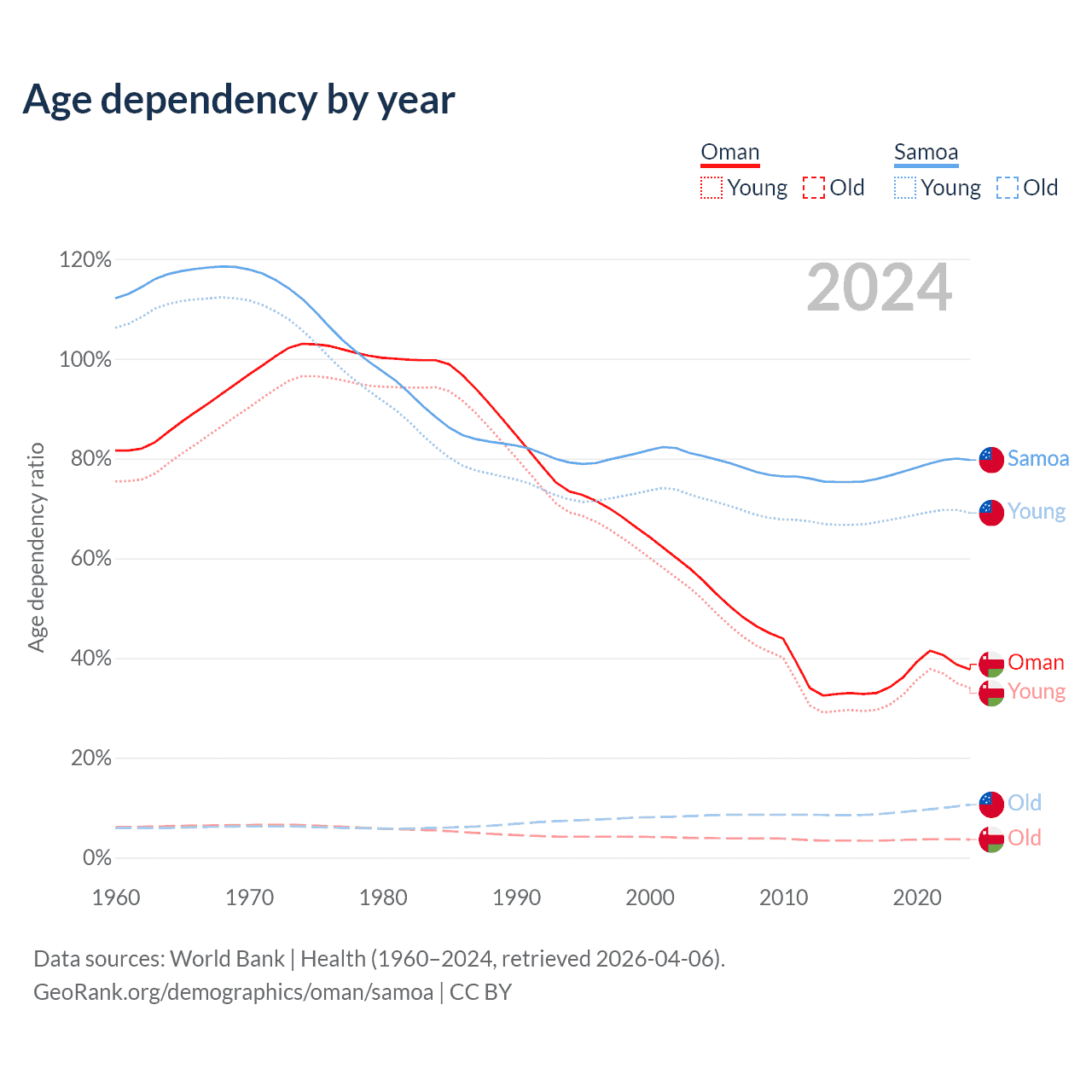 The share of older people aged 65 and over is 2.64% in Oman and 5.88% in Samoa. Life expectancy in Oman compared to Samoa .