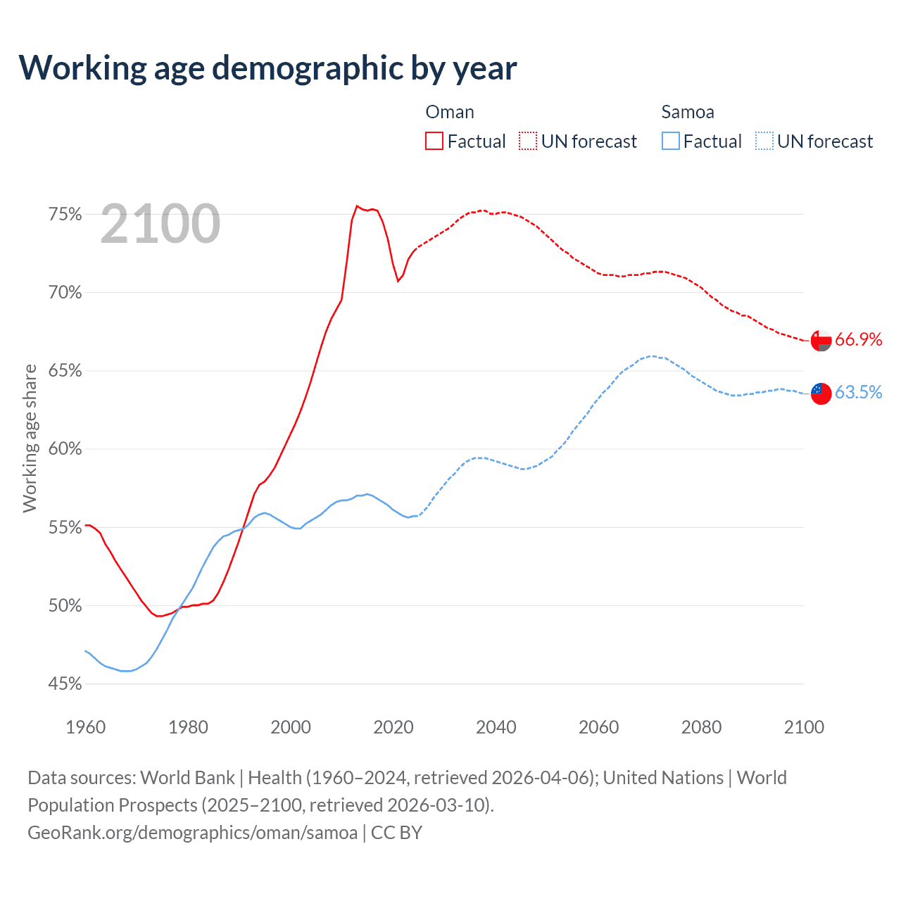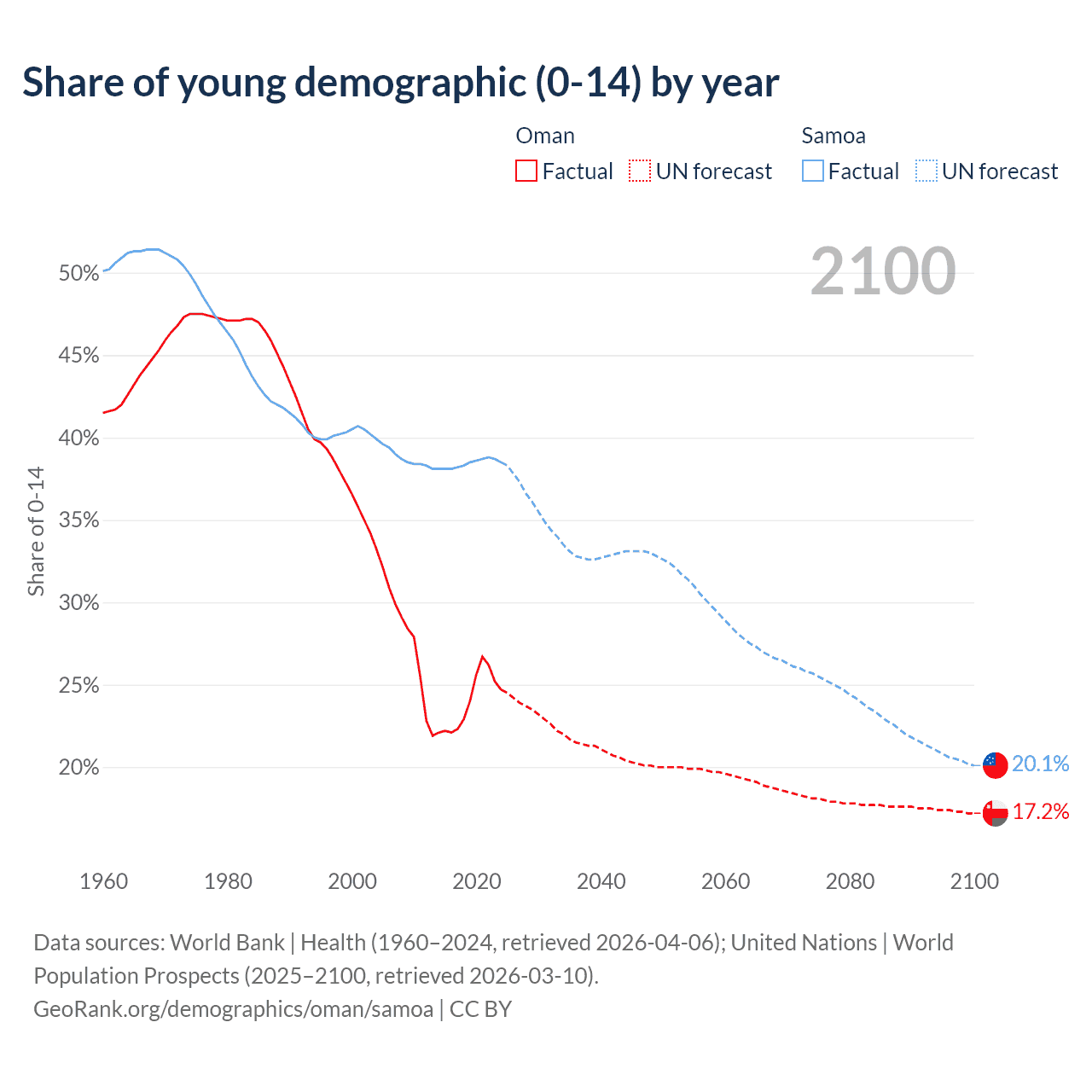 Median age Oman vs Samoa, 1960-2100