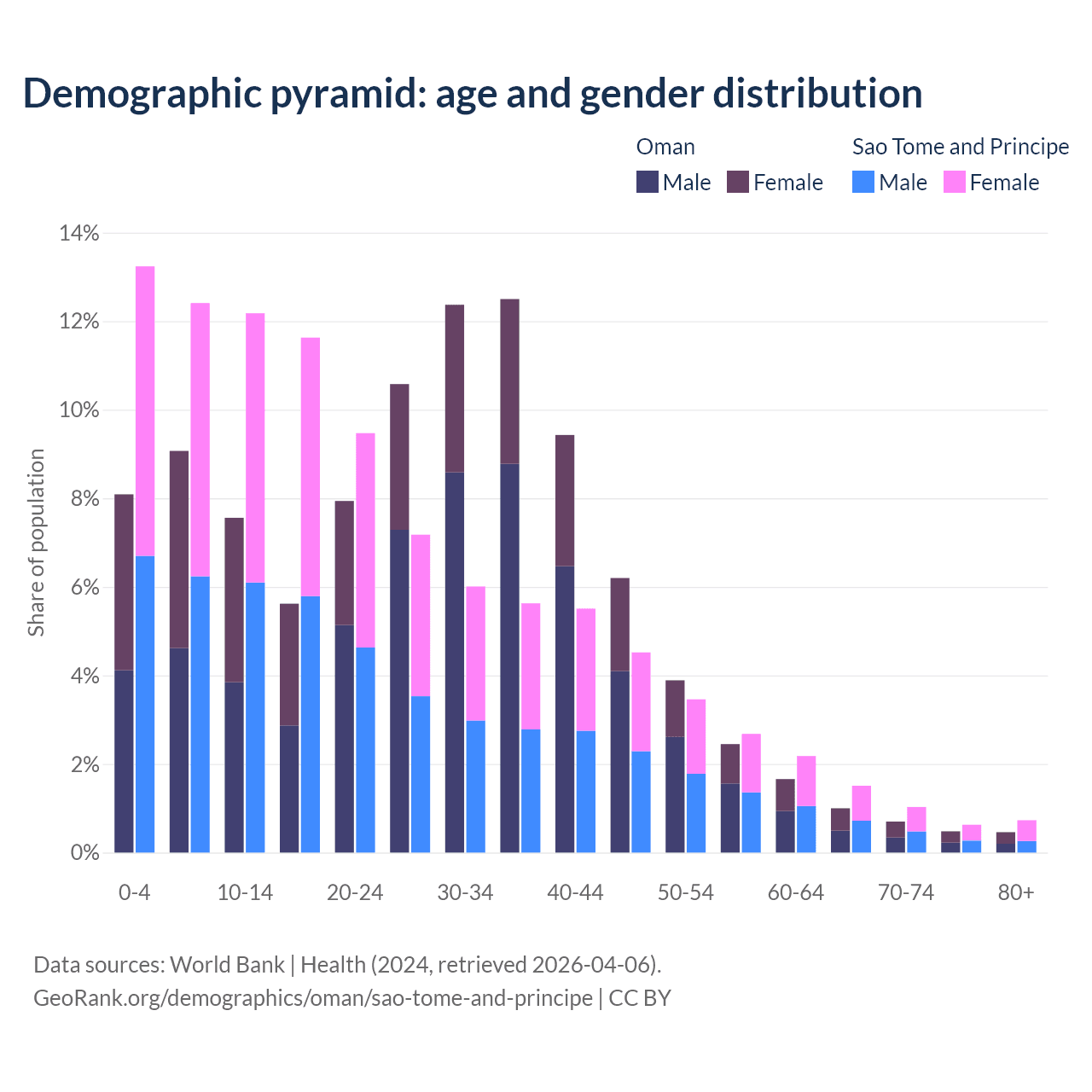 - Oman is ranked 101/196 by median age (oldest to youngest) vs 163/196 for Sao Tome and Principe.