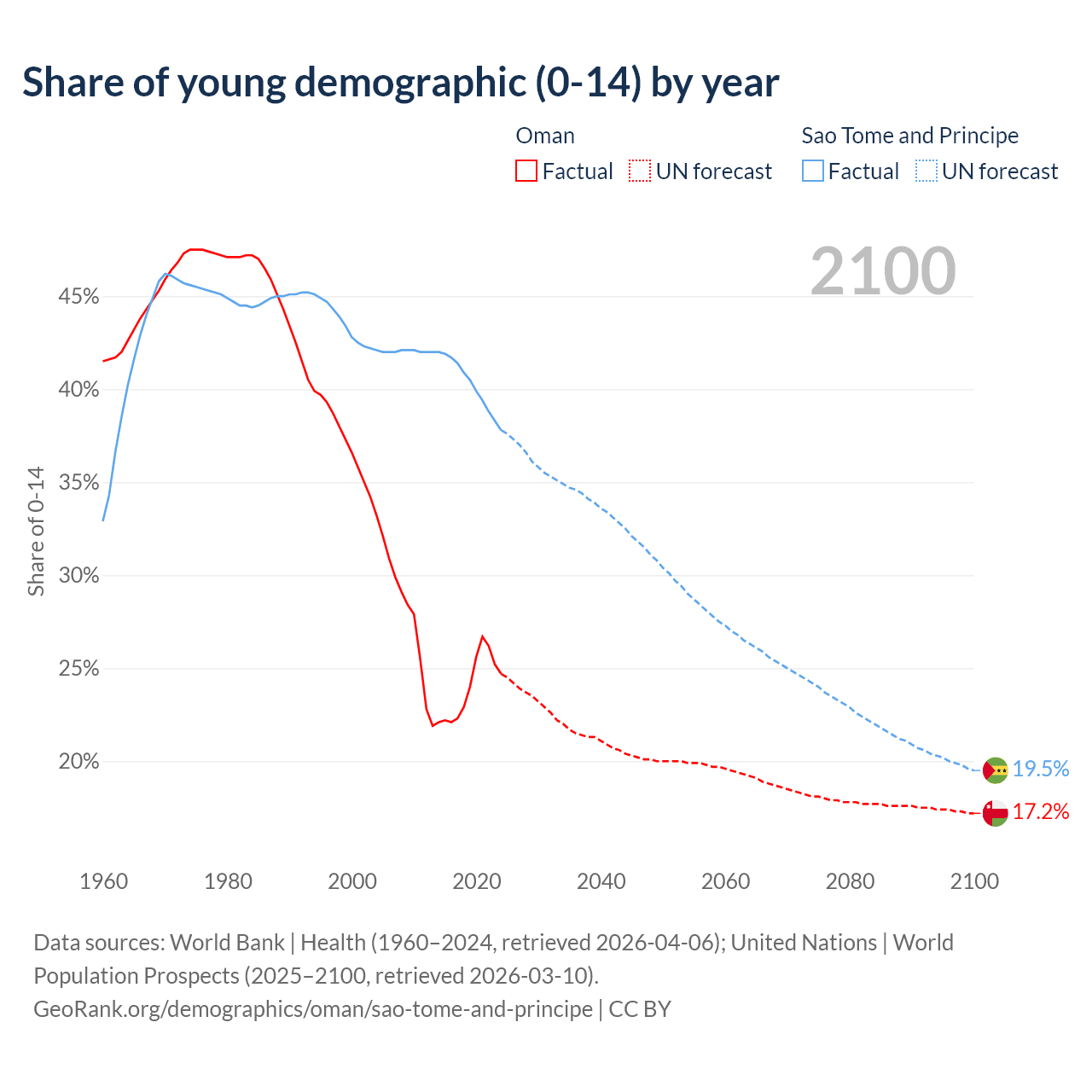- The share of young demographic (0-15 years old) in Oman is 24.7% vs 37.8% in Sao Tome and Principe.