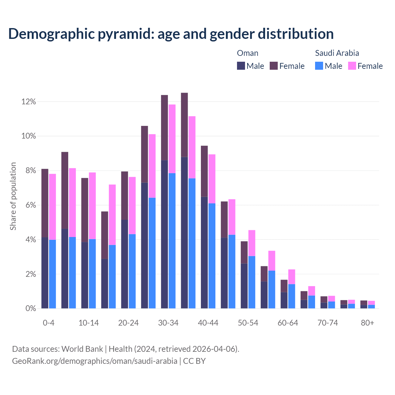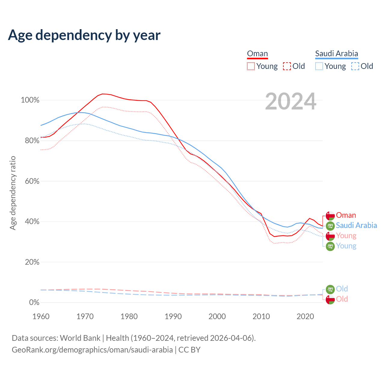 - Oman is ranked 101/196 by median age (oldest to youngest) vs 98/196 for Saudi Arabia.