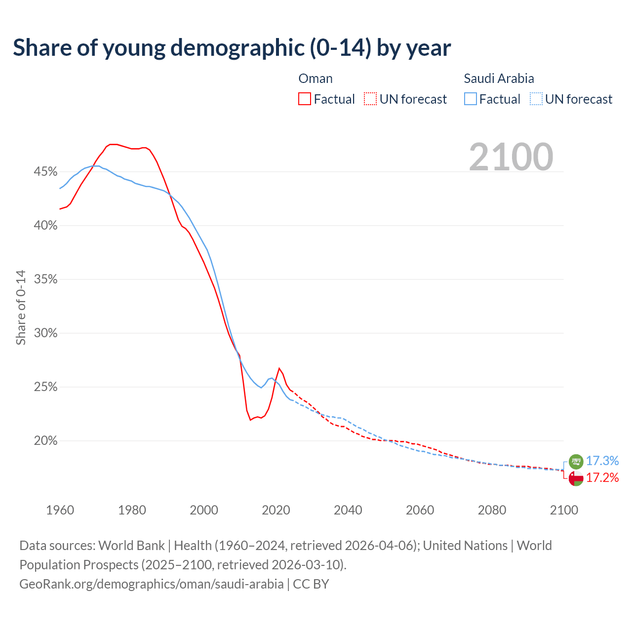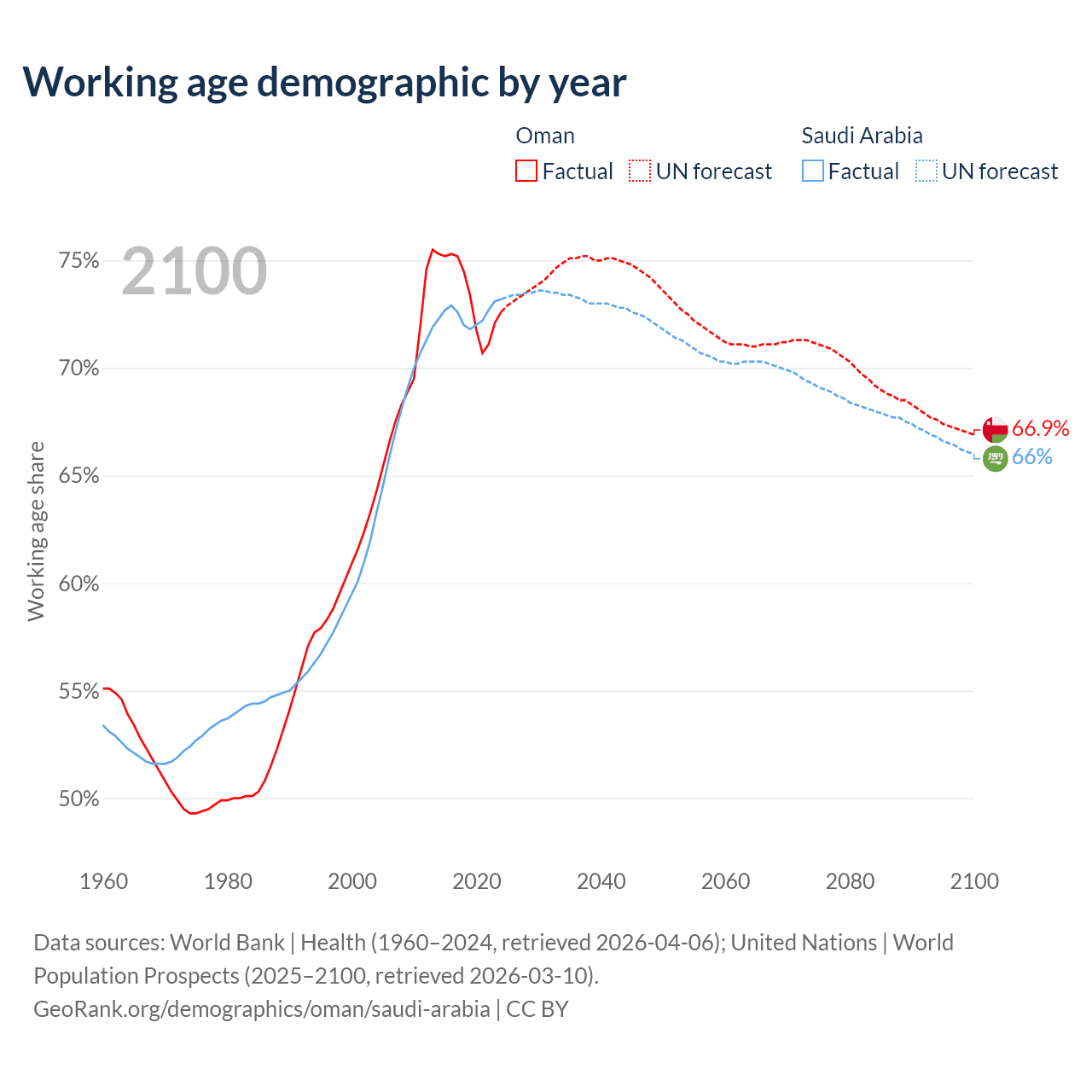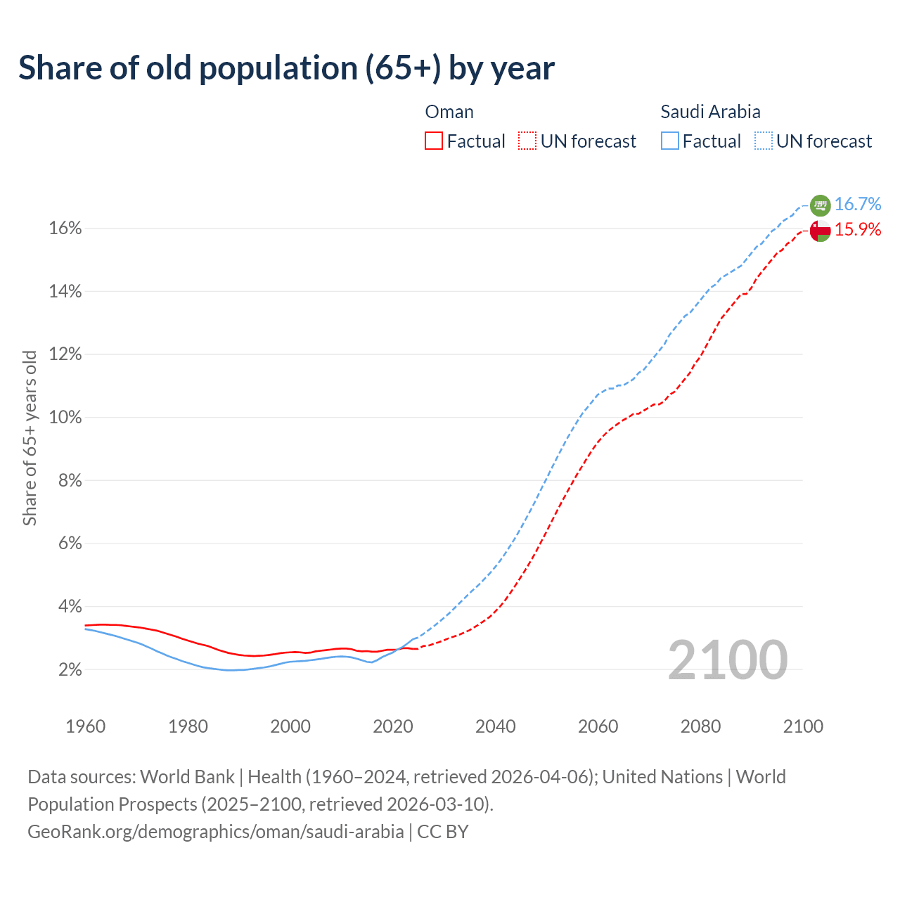 The share of older people aged 65 and over is 2.64% in Oman and 2.95% in Saudi Arabia. Life expectancy in Oman compared to Saudi Arabia .