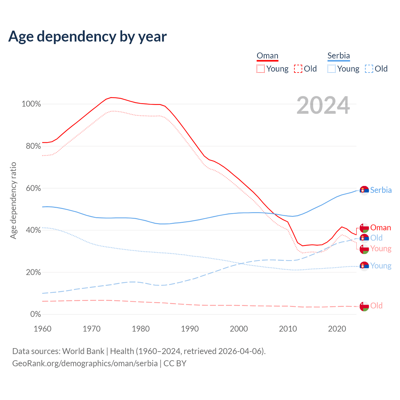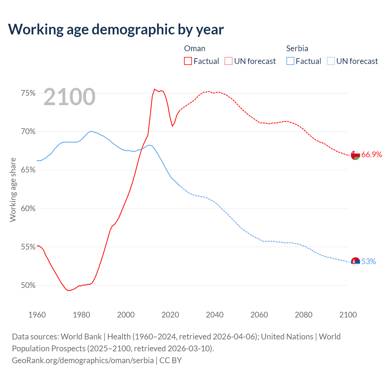 The share of older people aged 65 and over is 2.64% in Oman and 22.7% in Serbia. Life expectancy in Oman compared to Serbia .
