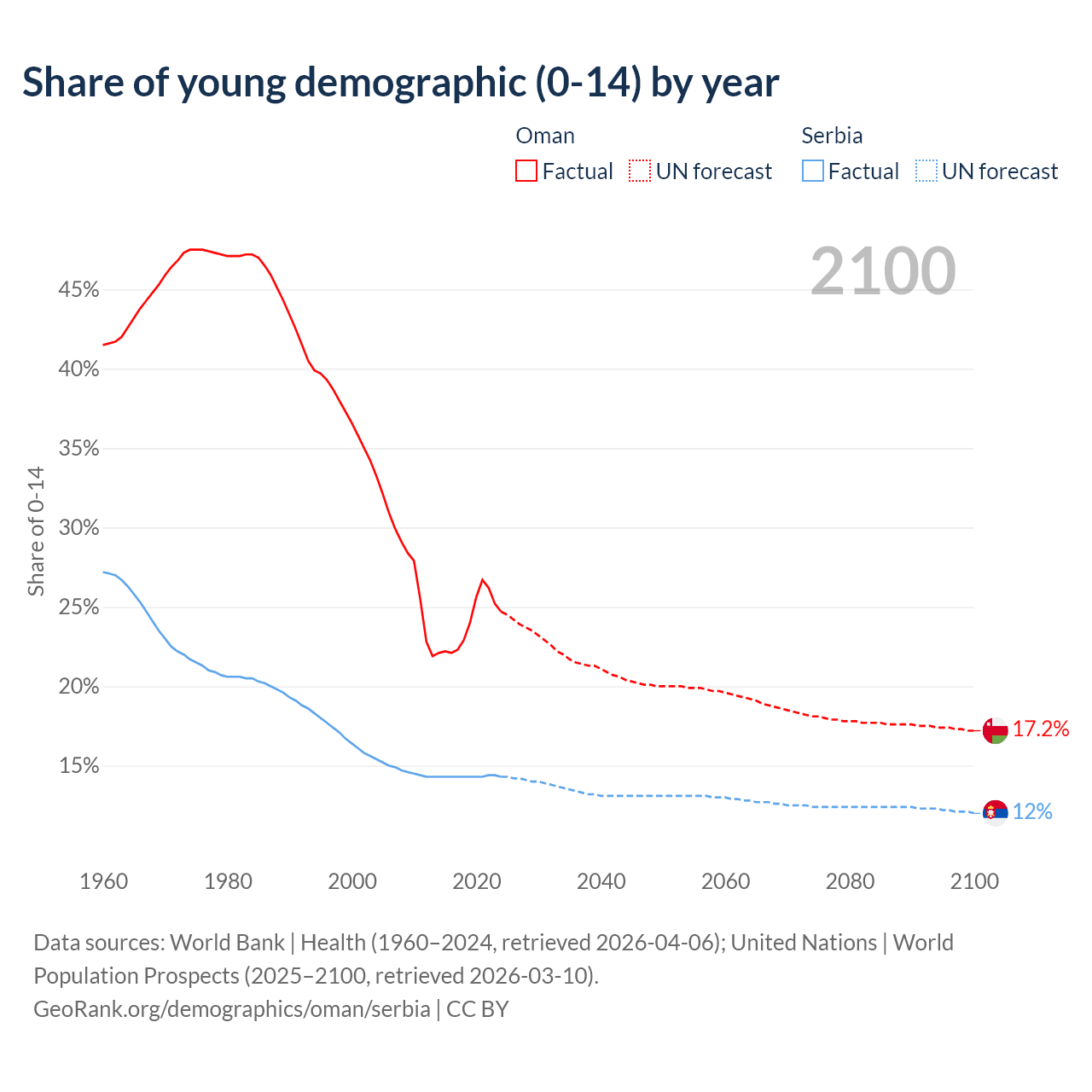 Median age Oman vs Serbia, 1960-2100