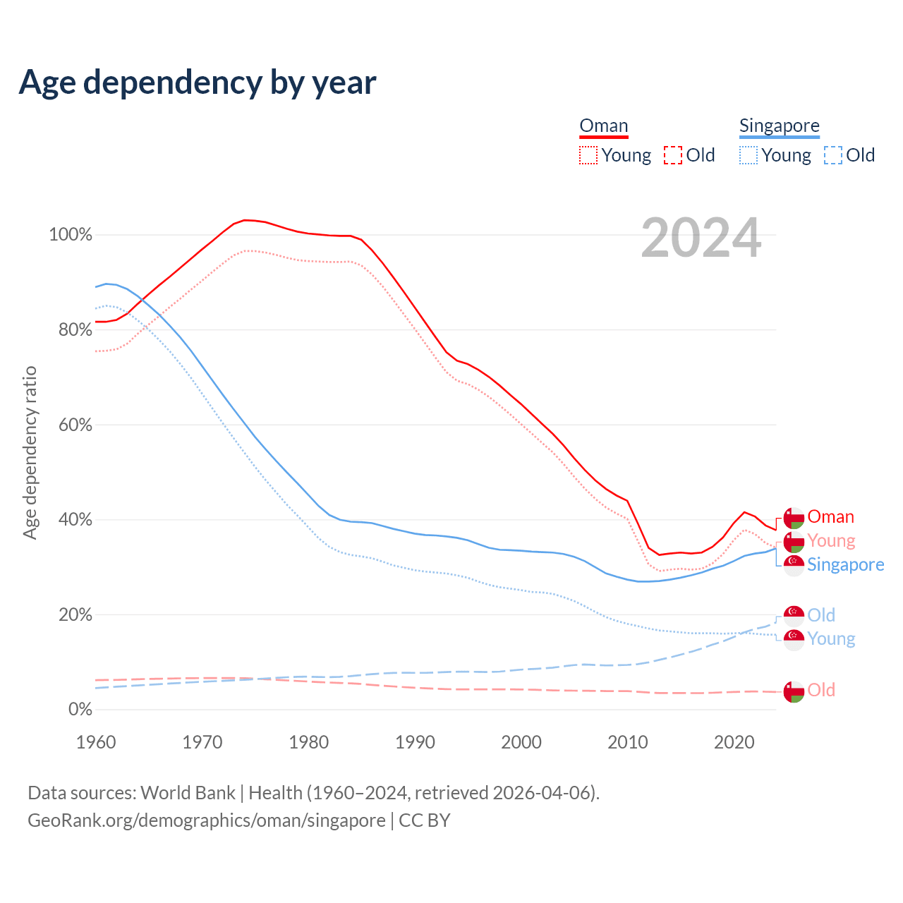 - Oman is ranked 101/196 by median age (oldest to youngest) vs 68/196 for Singapore.