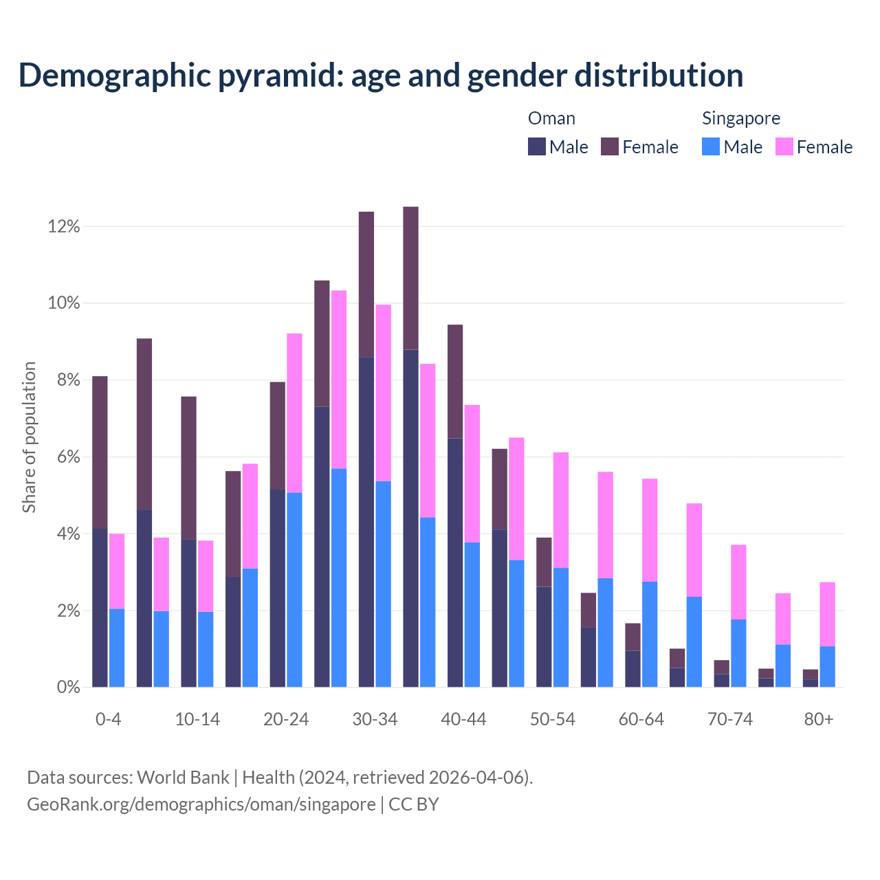- The median age in Oman is 30.5 years compared to 36.8 years in Singapore.