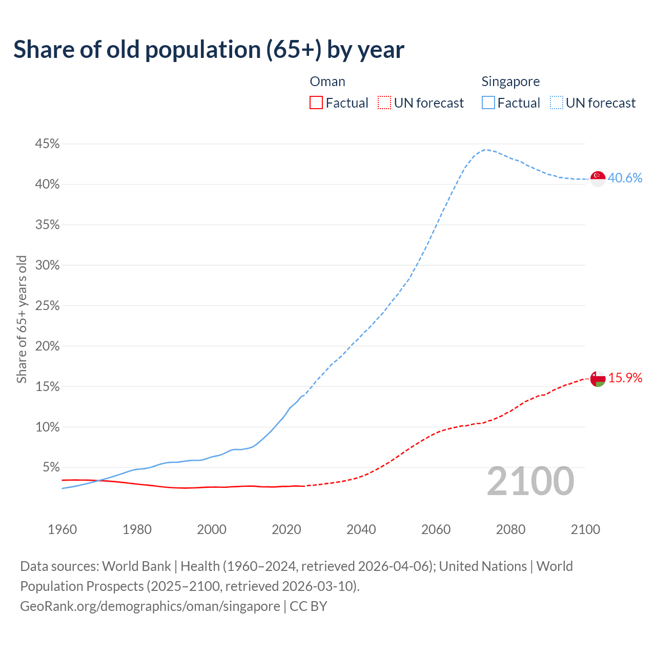 The share of older people aged 65 and over is 2.64% in Oman and 13.7% in Singapore. Life expectancy in Oman compared to Singapore .