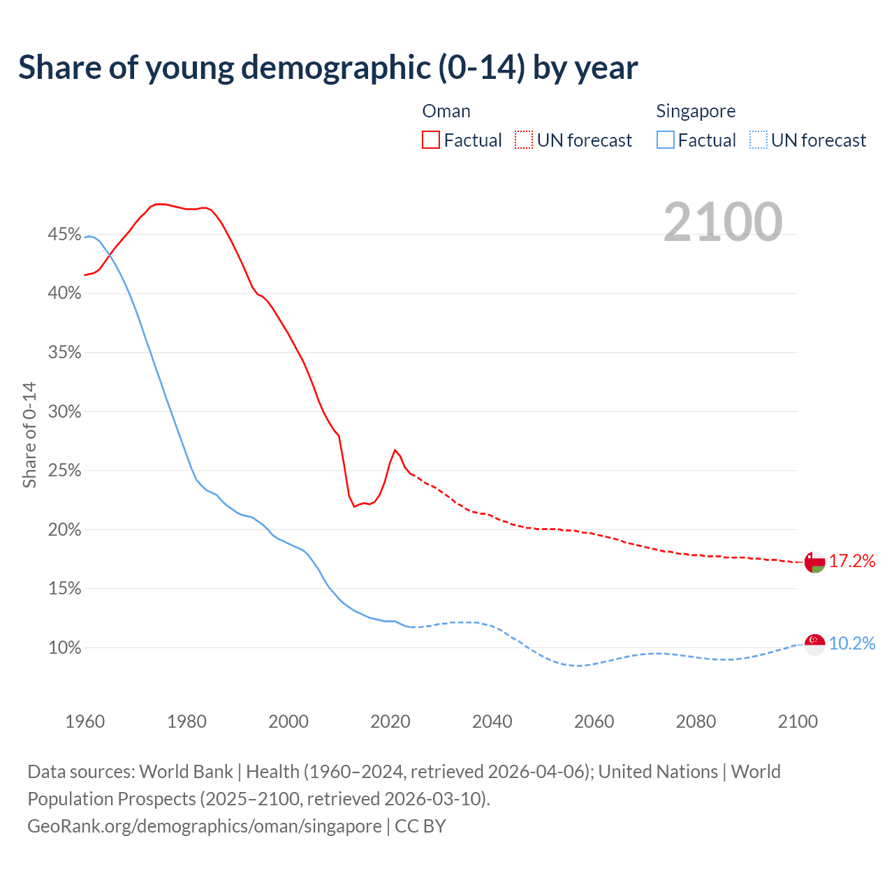 - The share of young demographic (0-15 years old) in Oman is 24.7% vs 11.7% in Singapore.