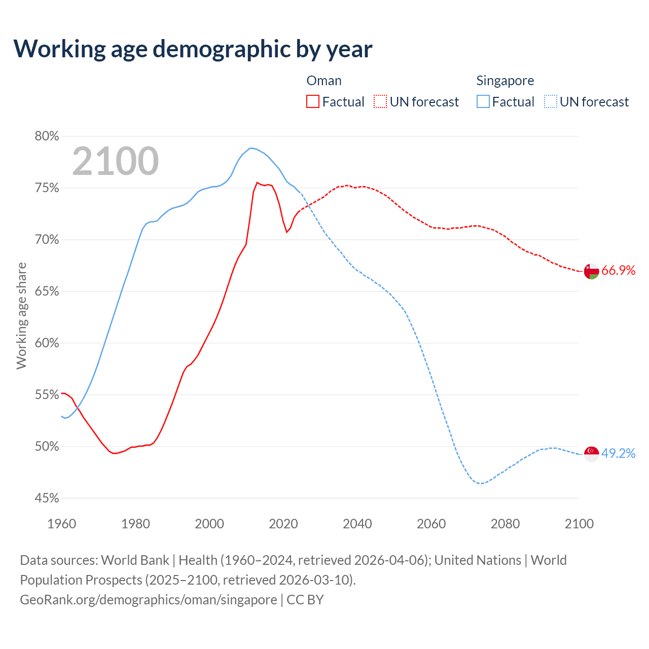 - Oman has 4.19M working age adults (aged 15-64) vs 4.57M in Singapore.