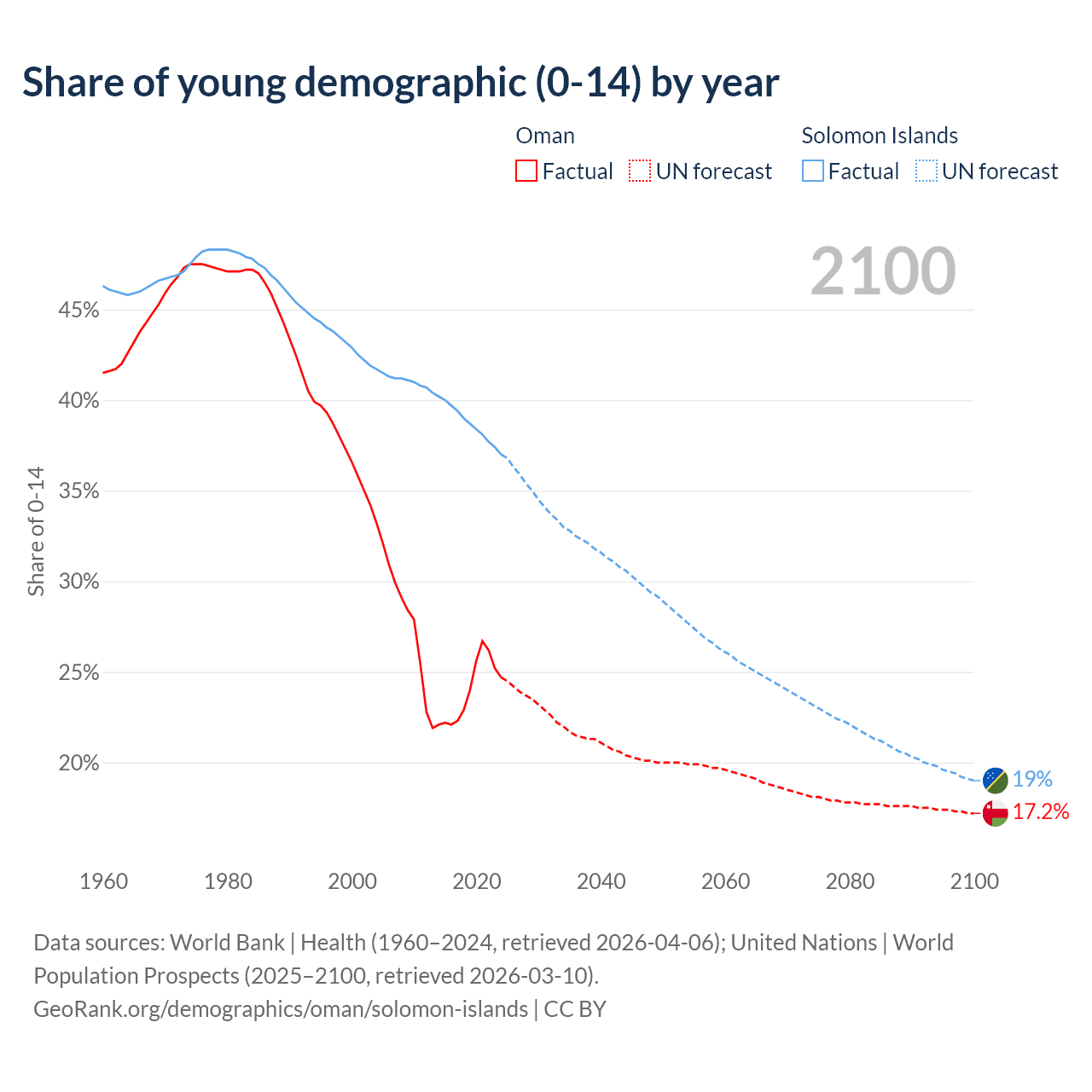 - The share of young demographic (0-15 years old) in Oman is 24.7% vs 37% in the Solomon Islands.