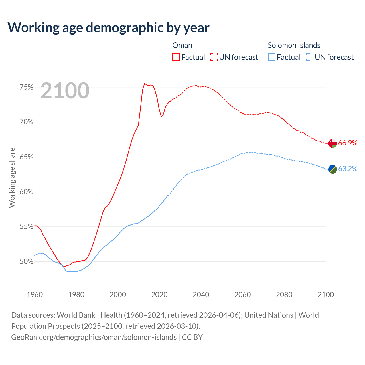 - Oman has 4.19M working age adults (aged 15-64) vs 513K in the Solomon Islands.
