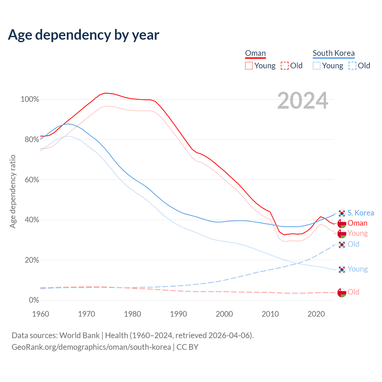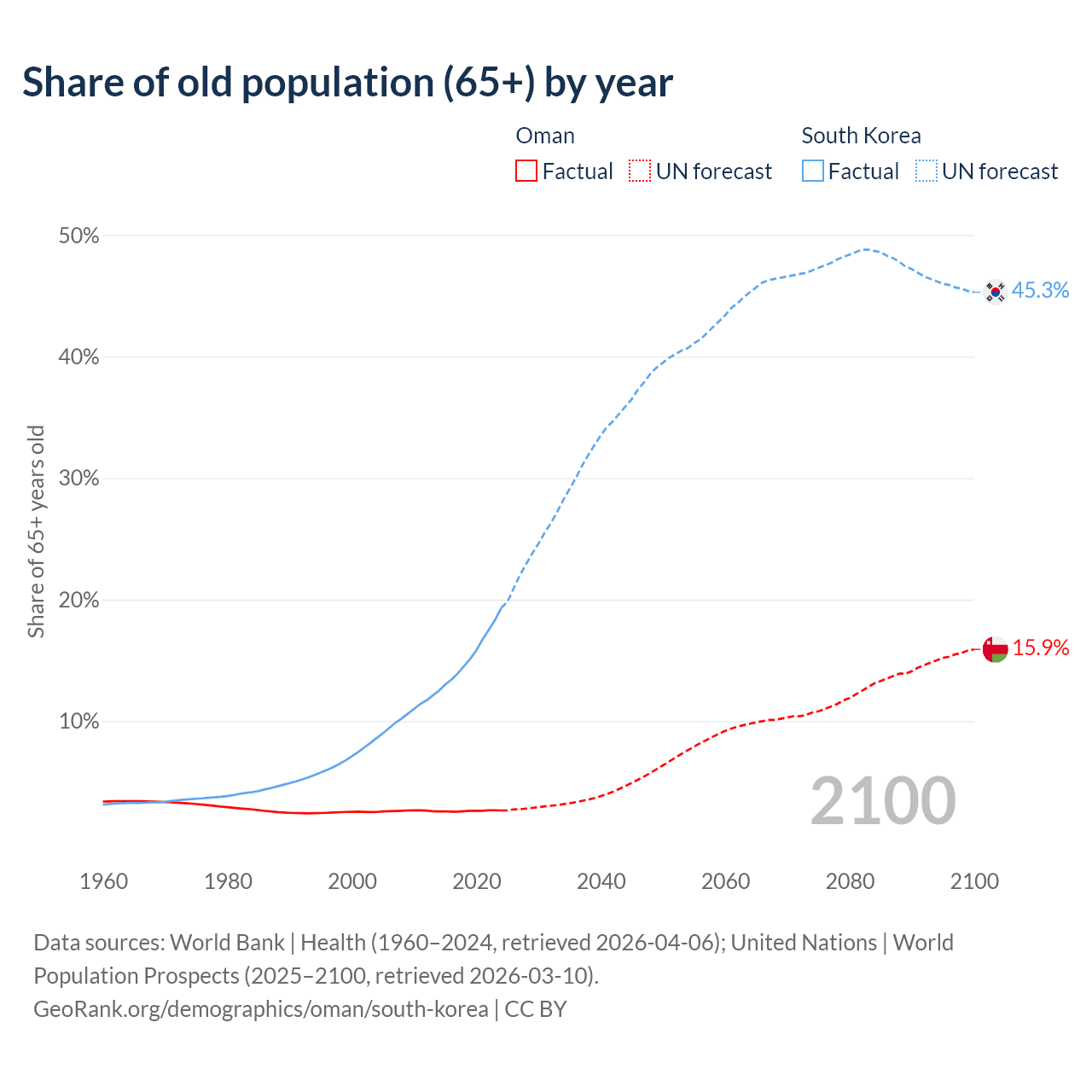 The share of older people aged 65 and over is 2.64% in Oman and 19.3% in South Korea. Life expectancy in Oman compared to South Korea .